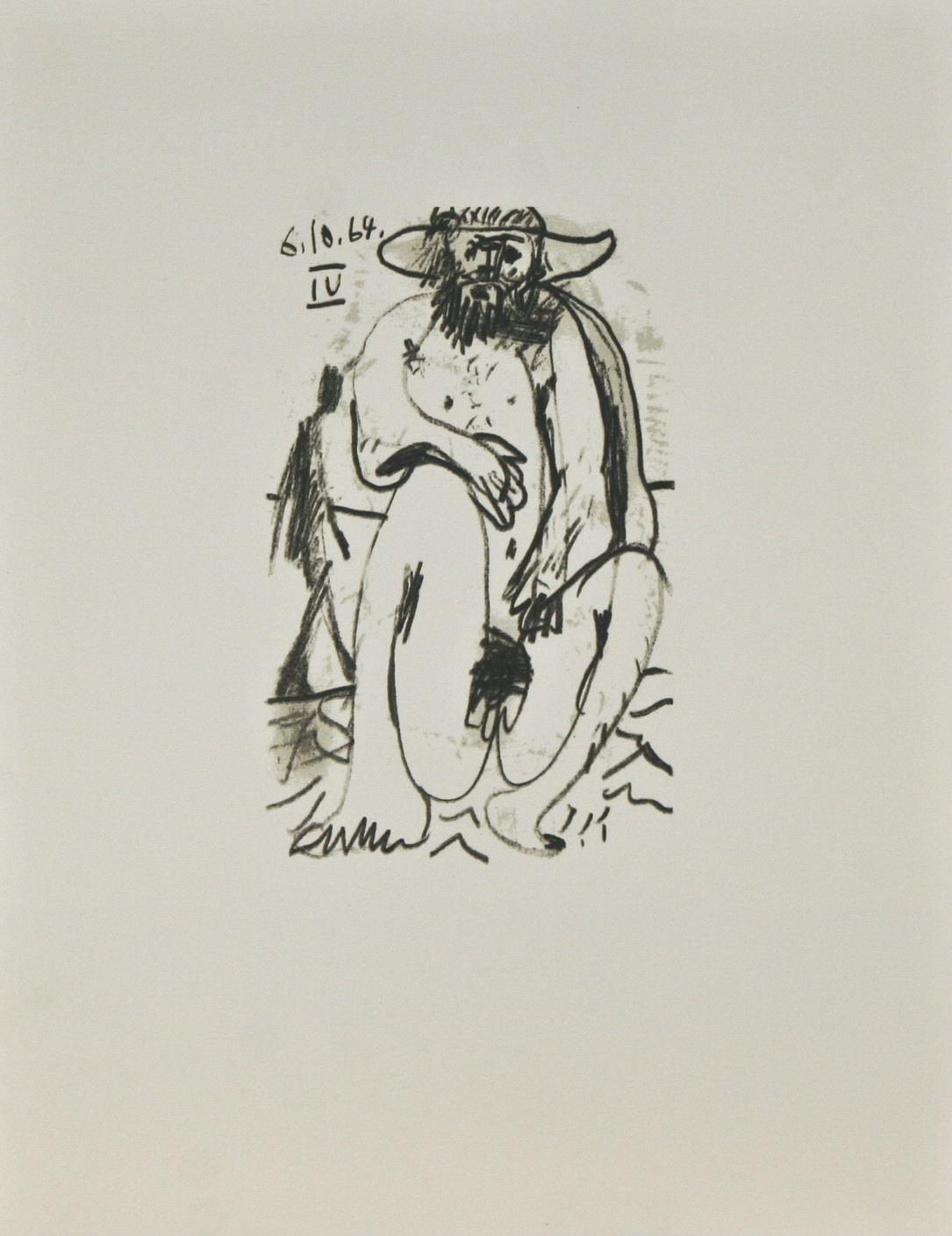 Le Gout du Bonheur is a "happy, playful and erotic" portfolio that is autobiographical in nature with self portraits of Picasso and caricatures of his friends. These prints are part of an album that comprises three of Picasso's studio sketchbooks dated respectively by the artist according to day, month, and year, as follows: 25.4.64-20.5.64, 15.9.64-6.10.64, 8.10.64-9.10.64.