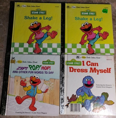 LOT OF 4 First Little Golden Books Sesame Street - ELMO AND GROVER. Condition is Acceptable. Books include TWO copies of Shake A Leg!, one copy of Zip! Pop! Hop!, and one copy of I Can Dress Myself.