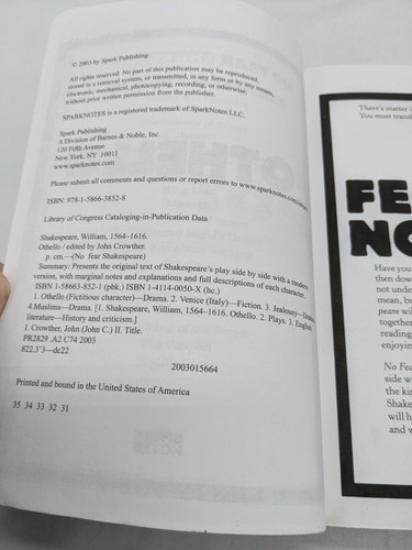 No Fear Shakespeare Othello Spark Notes Book. Combined Shipping (for USA Customers Only)
