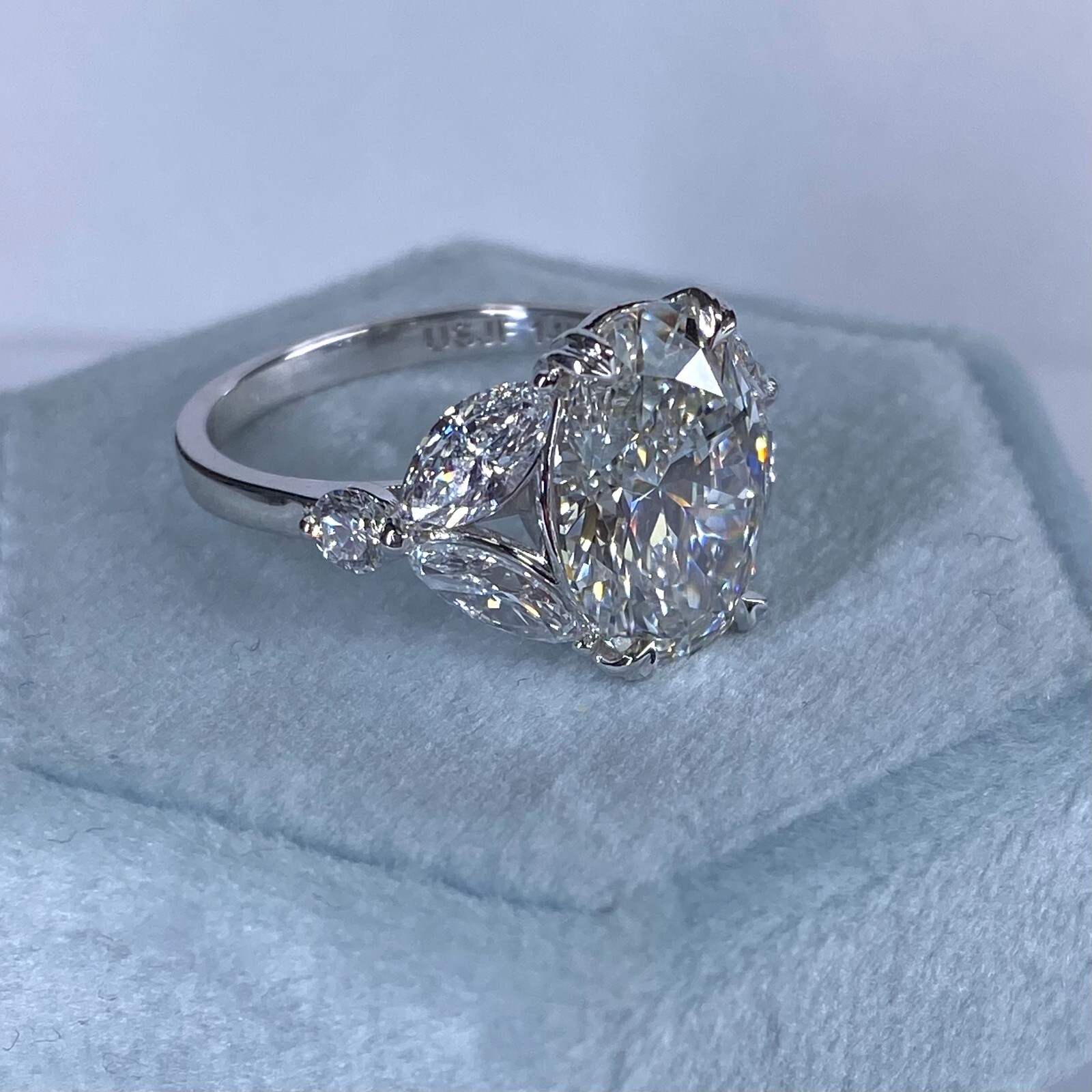Questo splendido anello presenta un diamante a taglio ovale certificato da 4.08 Carat, accentuato con diamanti in marchesa e taglio rotondo sui lati. Ambientato in elegante oro bianco 14k, offre un aspetto senza tempo e sofisticato.