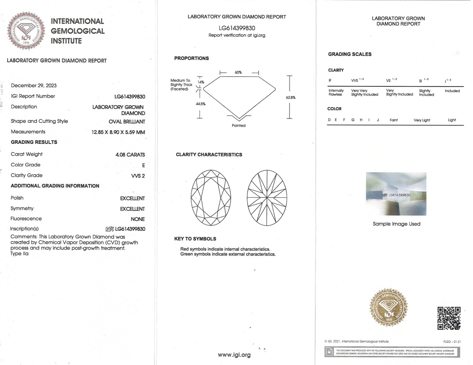 La cintura di Diamond Grown Grown Laboratory e laser inscritta con il numero del rapporto International Gemological Institute (IGI) LG614399830.