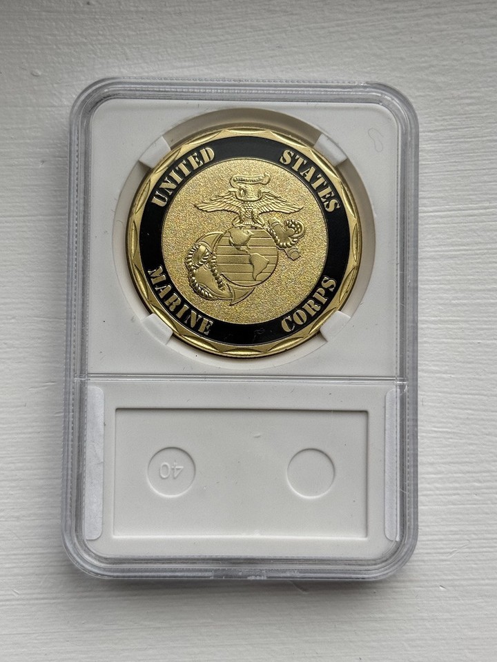 This is a great looking 25th Marine Regiment commemorative challenge coin. Coin is about 1 9/16" in diameter and gold plated. This coin has a 25th Marine Regiment insignia on front in raised lettering and the Marine Corps logo on the reverse. Coin is contained in an acrylic air tight holder.