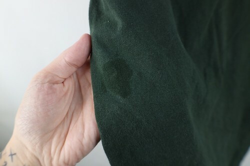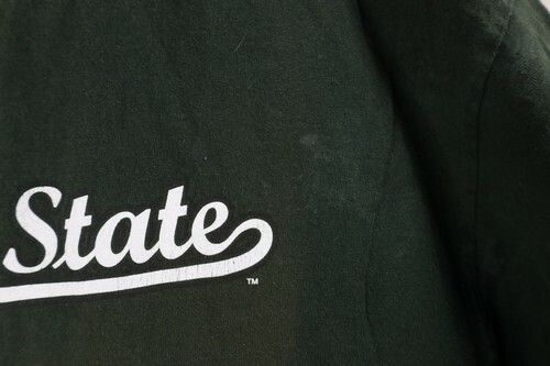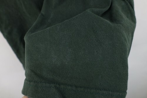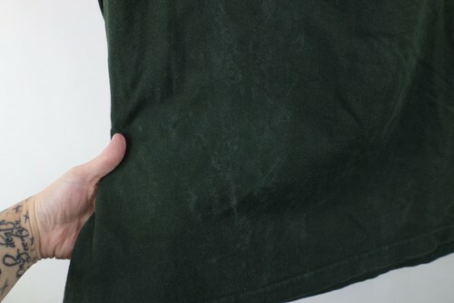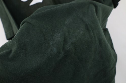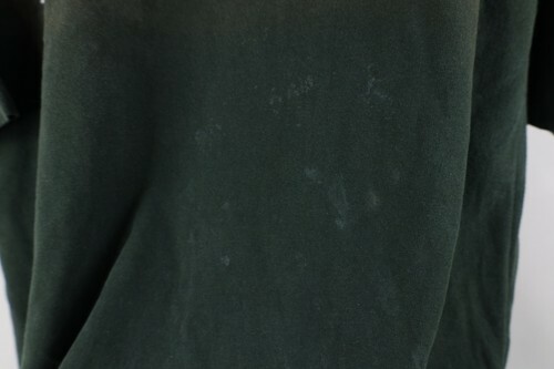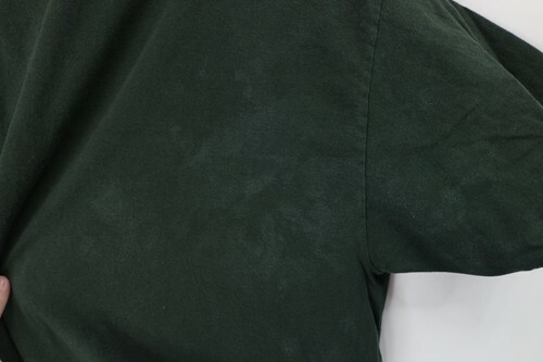 Stains/dark spots, discoloring throughout. Collar, arms discolored. Graphics cracking, color faded. Pilling. Loose threads tag