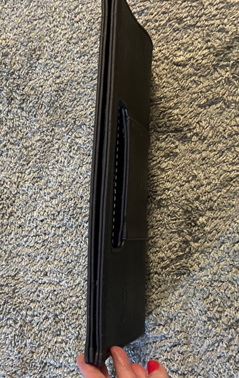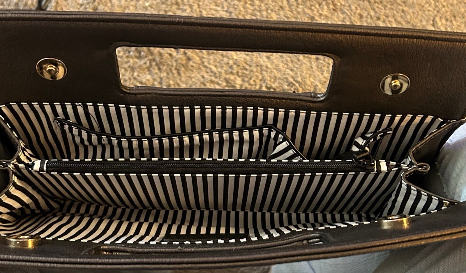The Charming Charlie Snap Closure Black Faux Leather Clutch Purse is a stylish and compact accessory perfect for parties or formal occasions. This rectangular purse features a snap closure, silver hardware, and a black exterior made of faux leather. The i