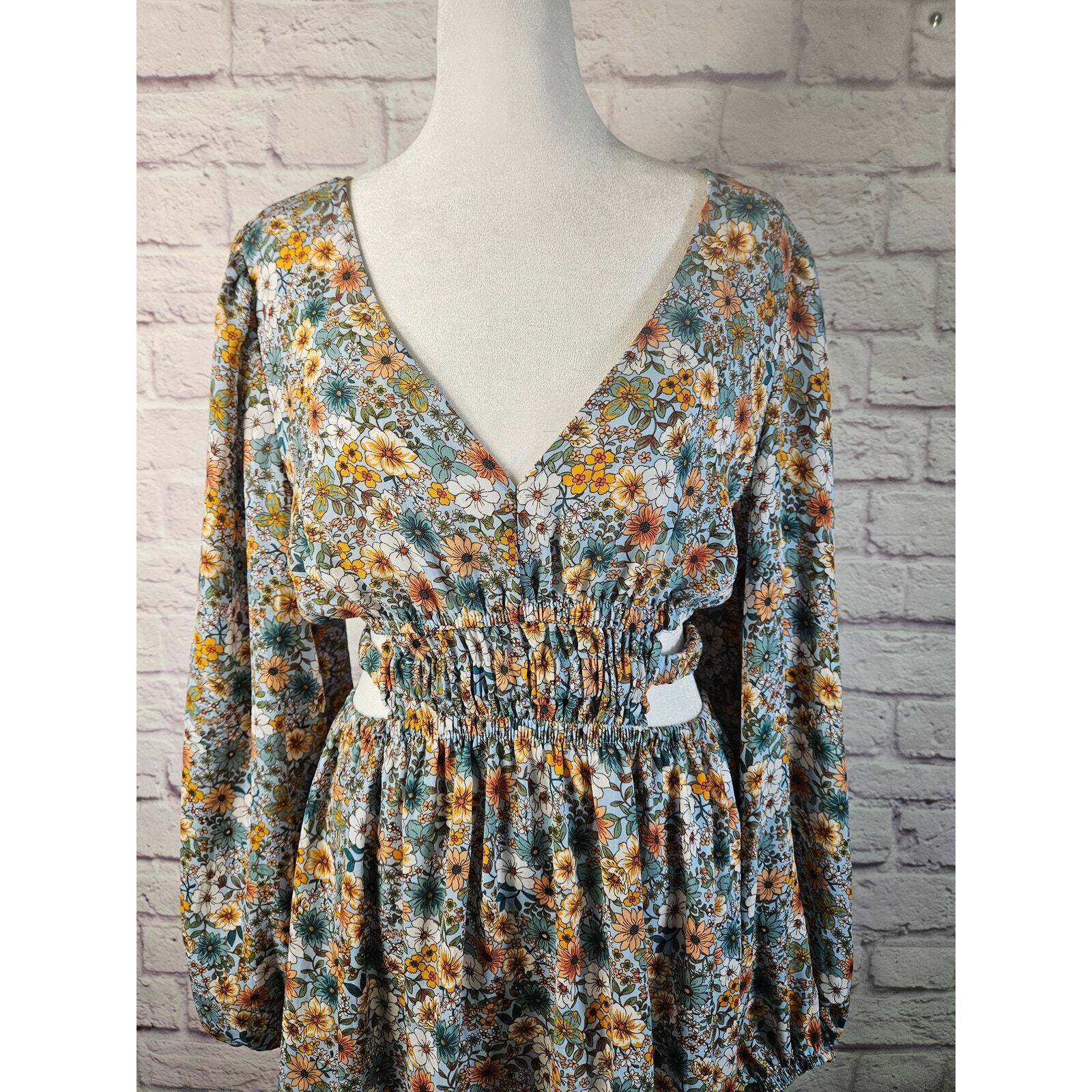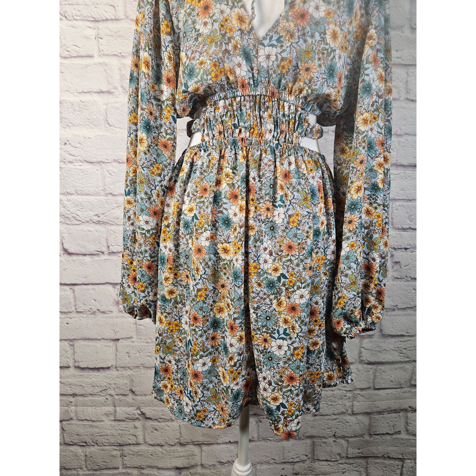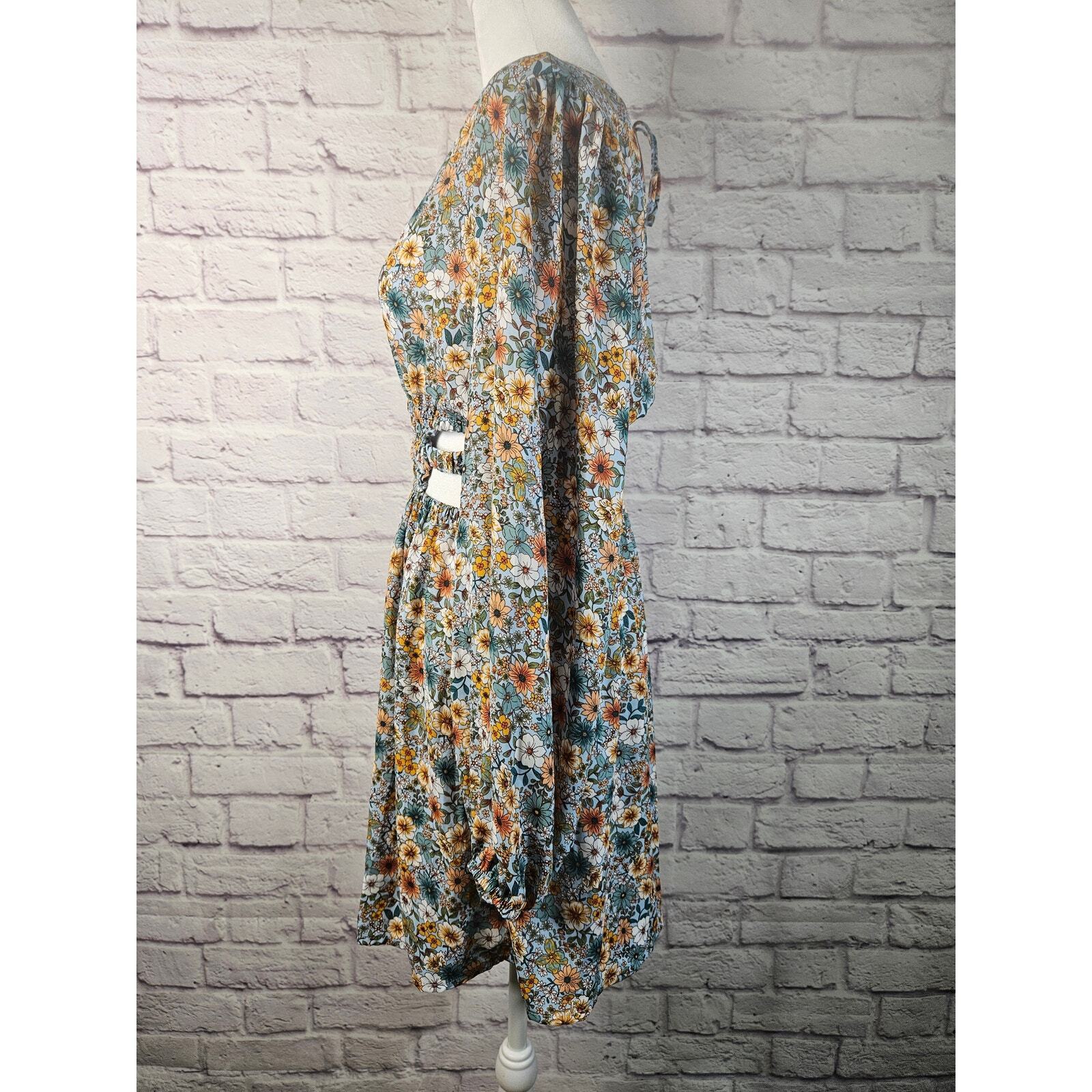 No Comment Womens L Floral Dress Side Waist Slits Puffy Sleeves Boho