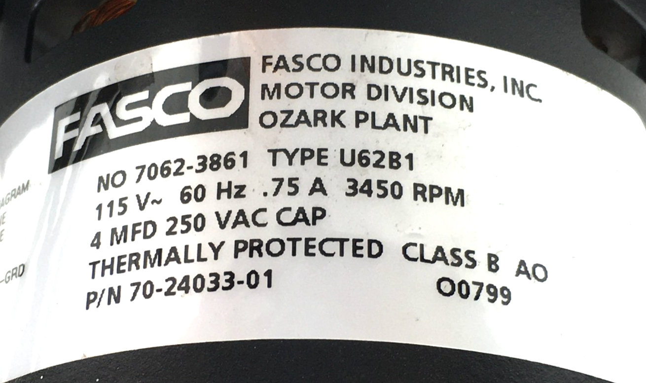 This is FASCO 7062-3861 Inducer Blower Motor Assembly Rheem 70-24033-01 115V 3450 RPM used part.