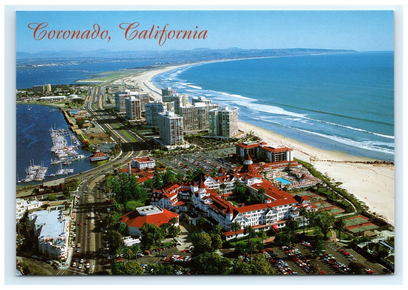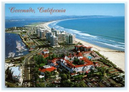 This postcard highlights the stunning aerial perspective of Coronado, California, showing the iconic red-roofed Hotel Del Coronado beside shimmering ocean waters and golden beaches stretching toward Mexico.