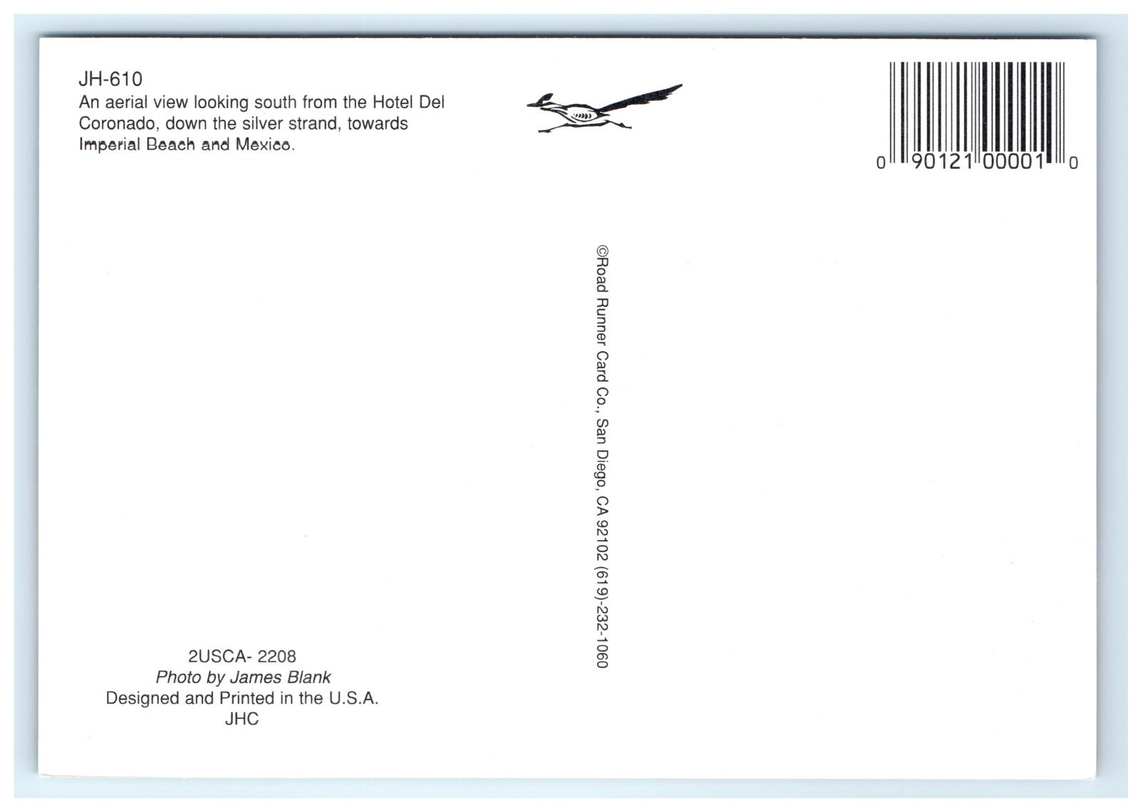 ? Back: Unused. Published by Road Runner Card Co., San Diego, California. Photo by James Blank. Card No. 2USCA-2208 / JH-610. Designed and printed in U.S.A.