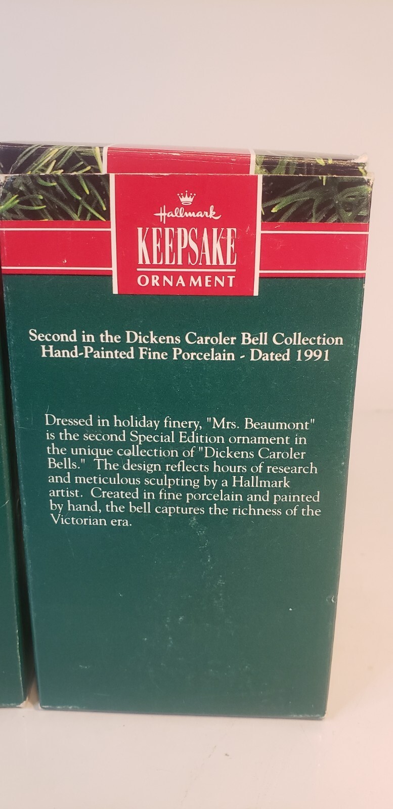 Add some classic charm to your Christmas tree with this lot of two Hallmark Keepsake Ornaments. These ornaments feature Mrs. Cratchit and Dickens Caroler Bell Mrs. Beaumont, both crafted from high-quality porcelain in 1991. The vibrant multicolor designs and intricate details make them stand out among other ornaments.