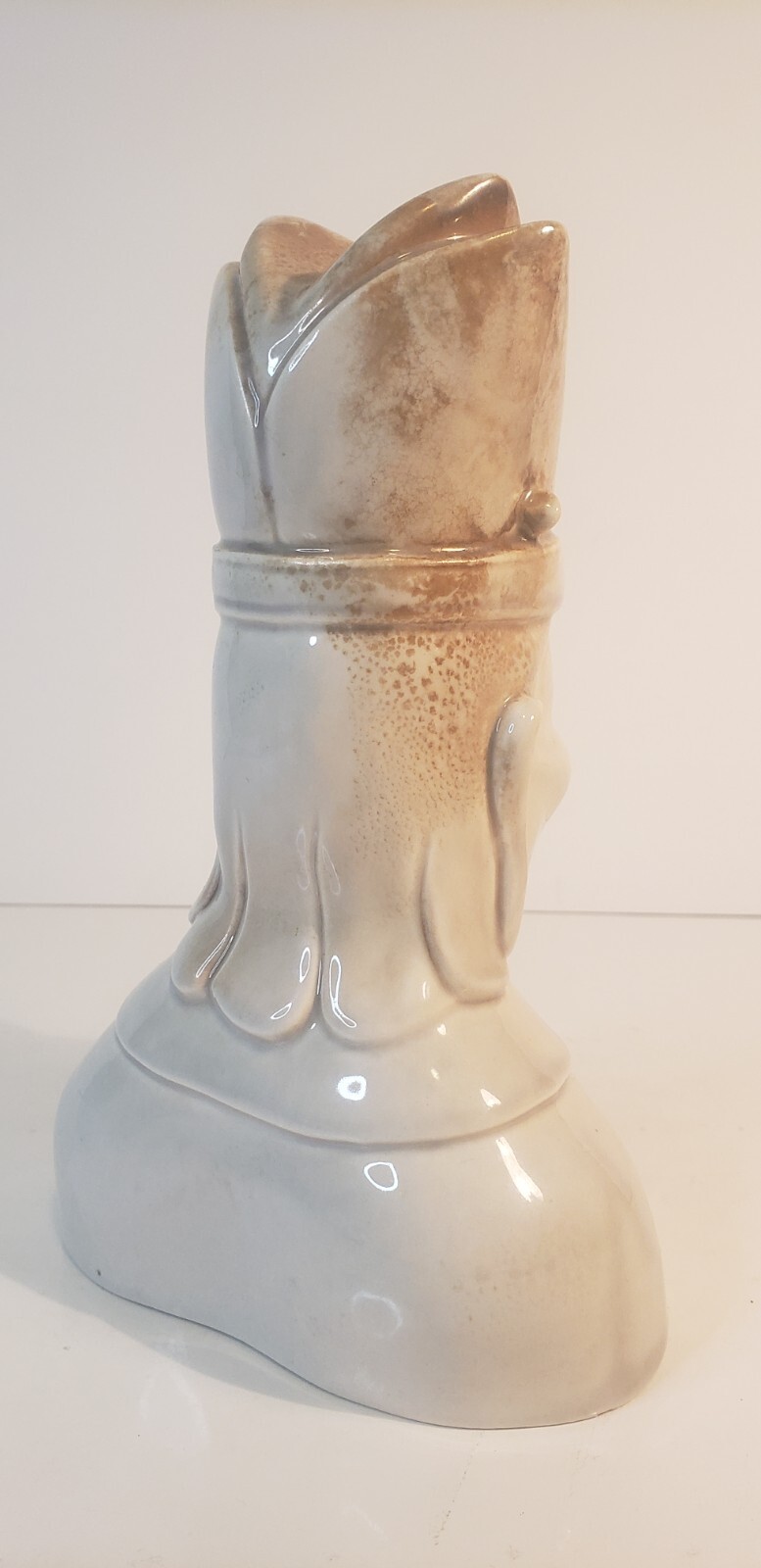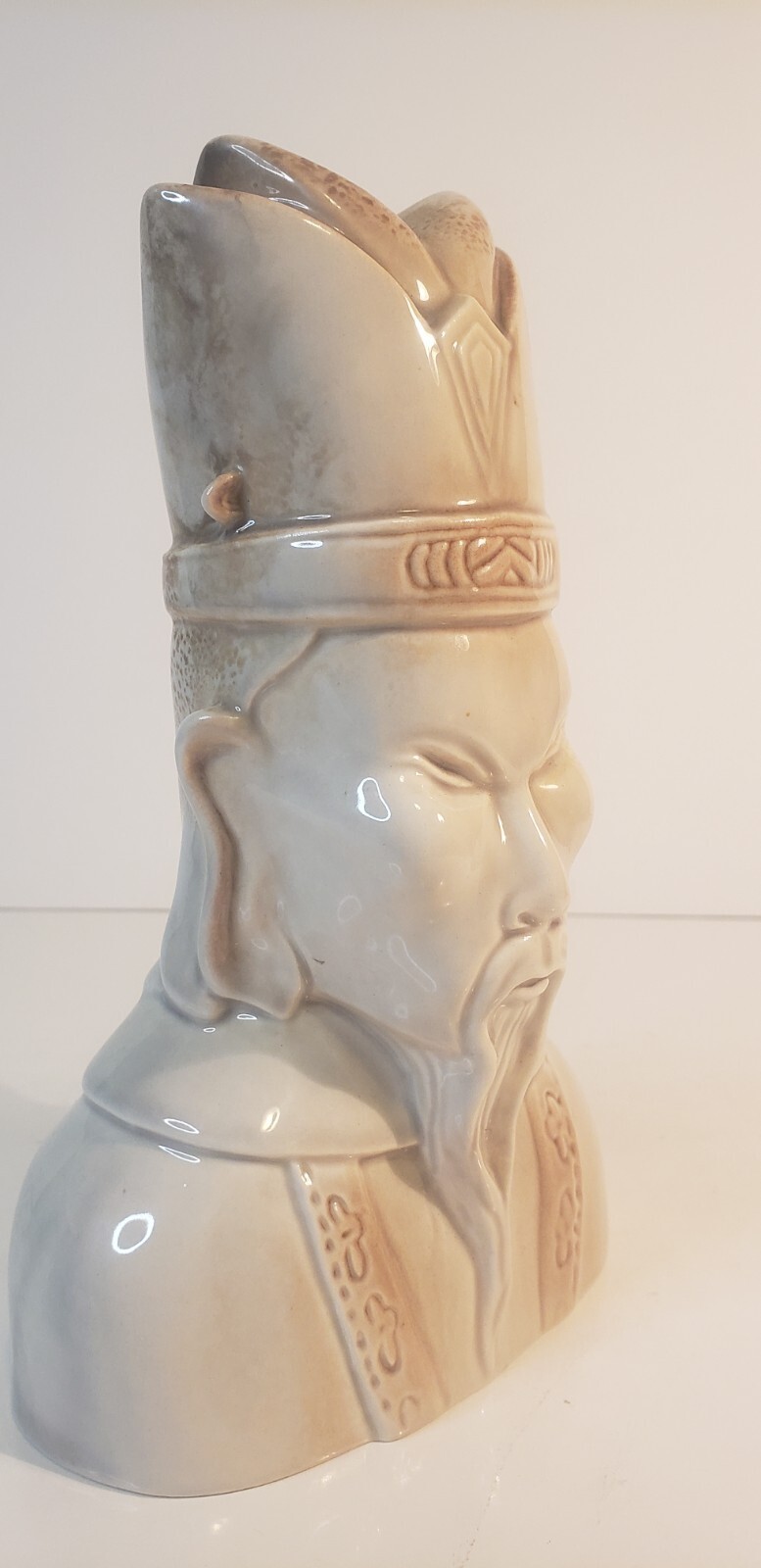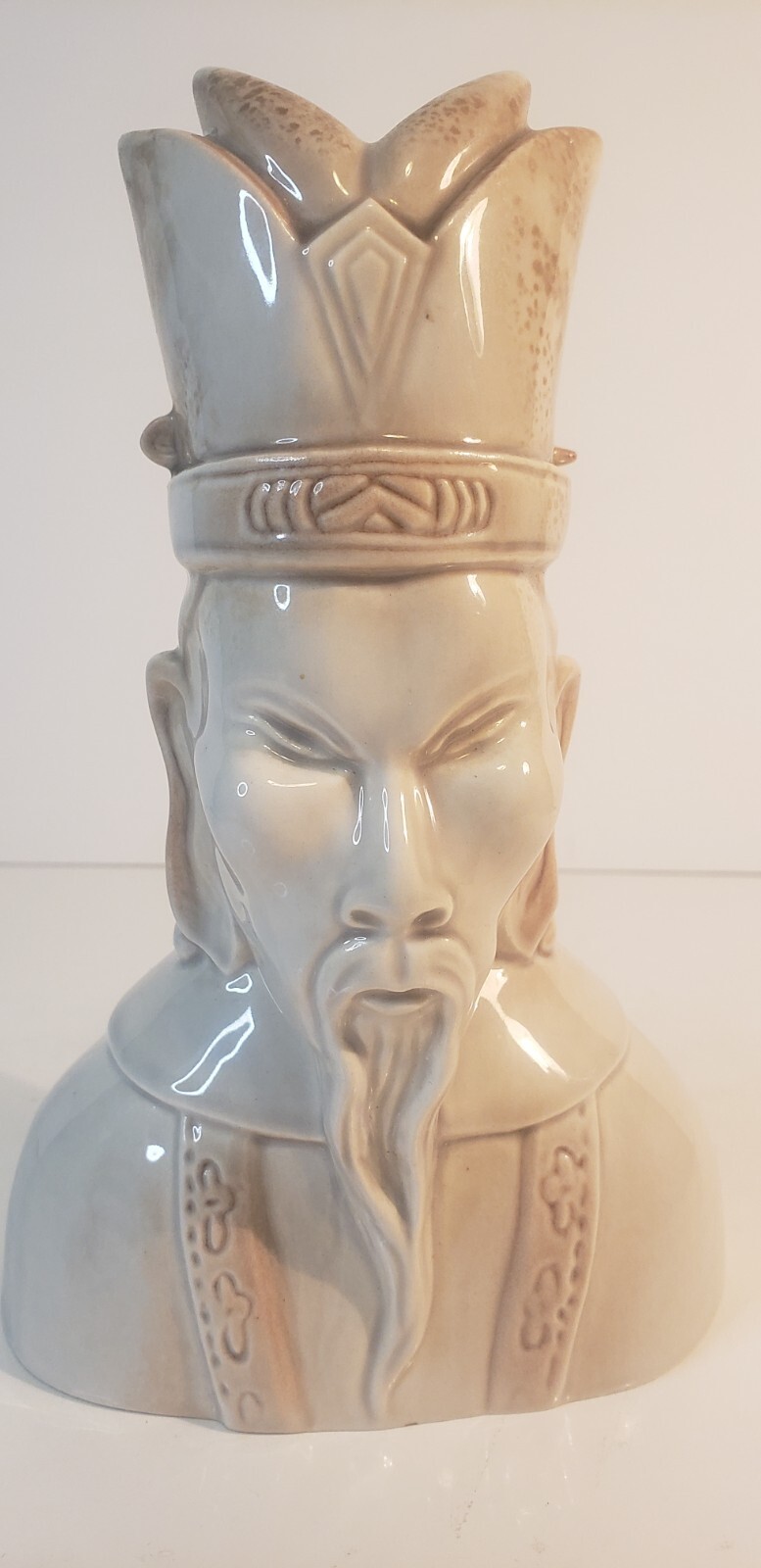 This mid-century Roselane Pasadena art pottery bust embodies the fusion of Chinese aesthetic with sleek modernist design. Finished in dove gray glaze, the sculptural figure features elegant facial detail and a high gloss finish typical of 1940s California pottery. A unique piece that balances cultural representation and decorative modernism.