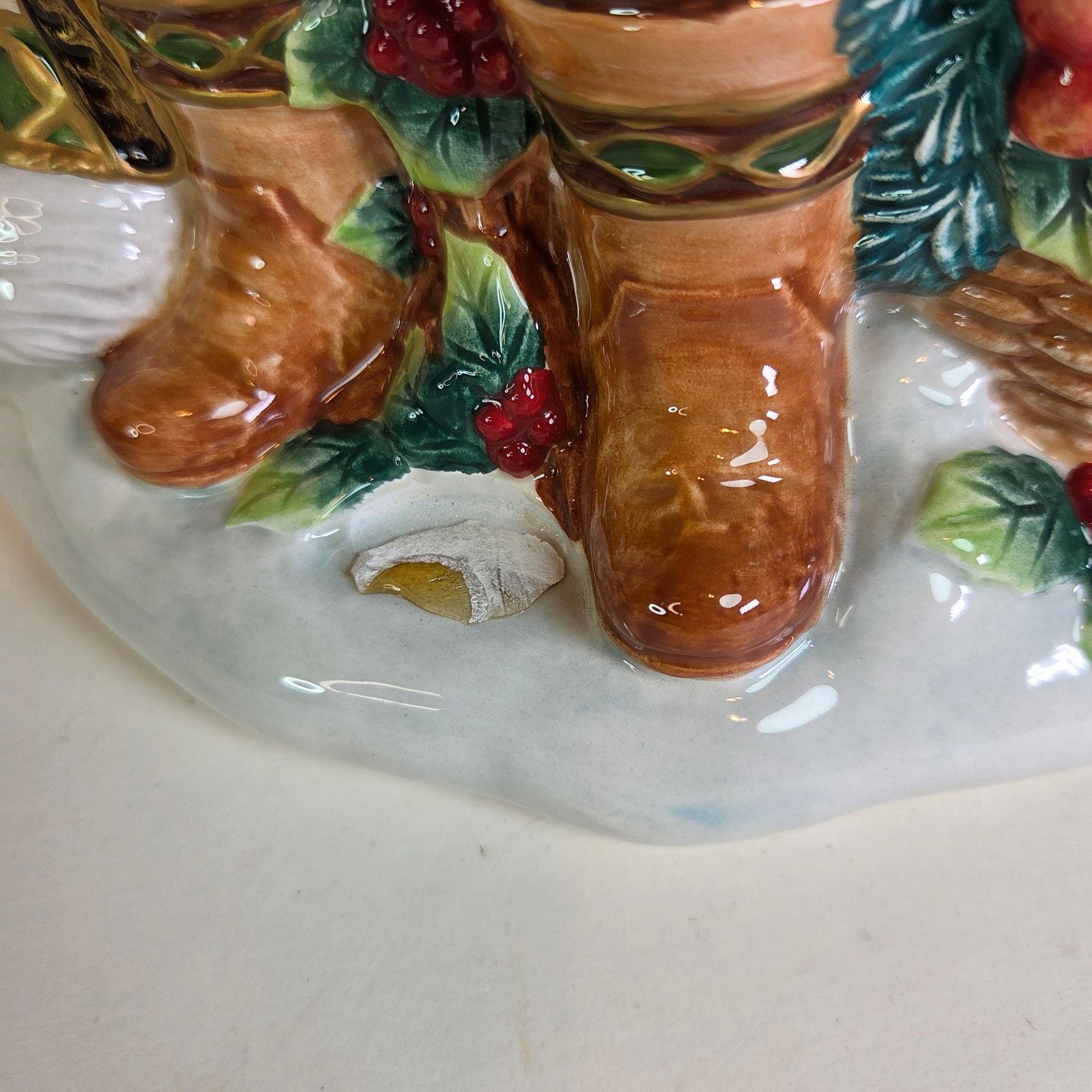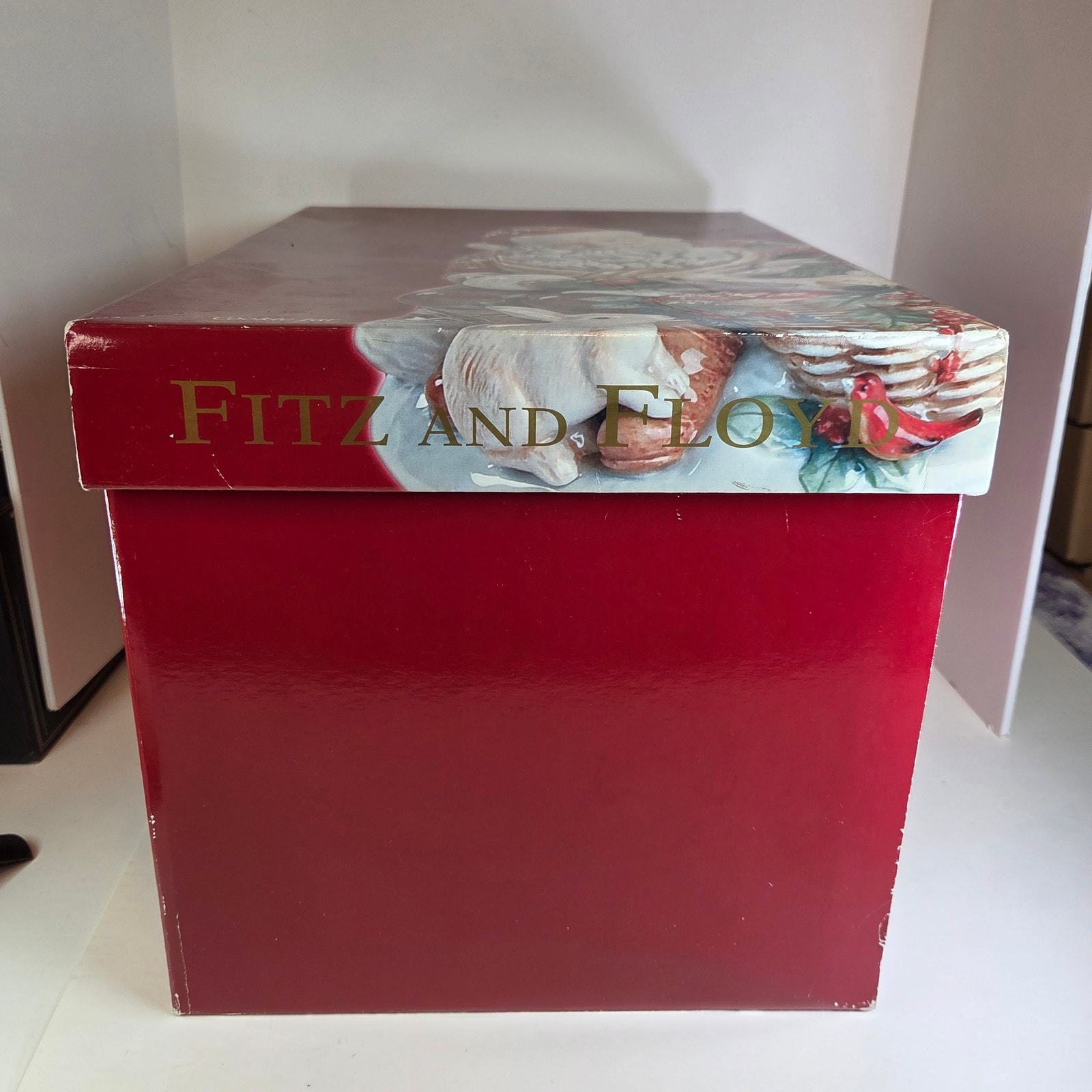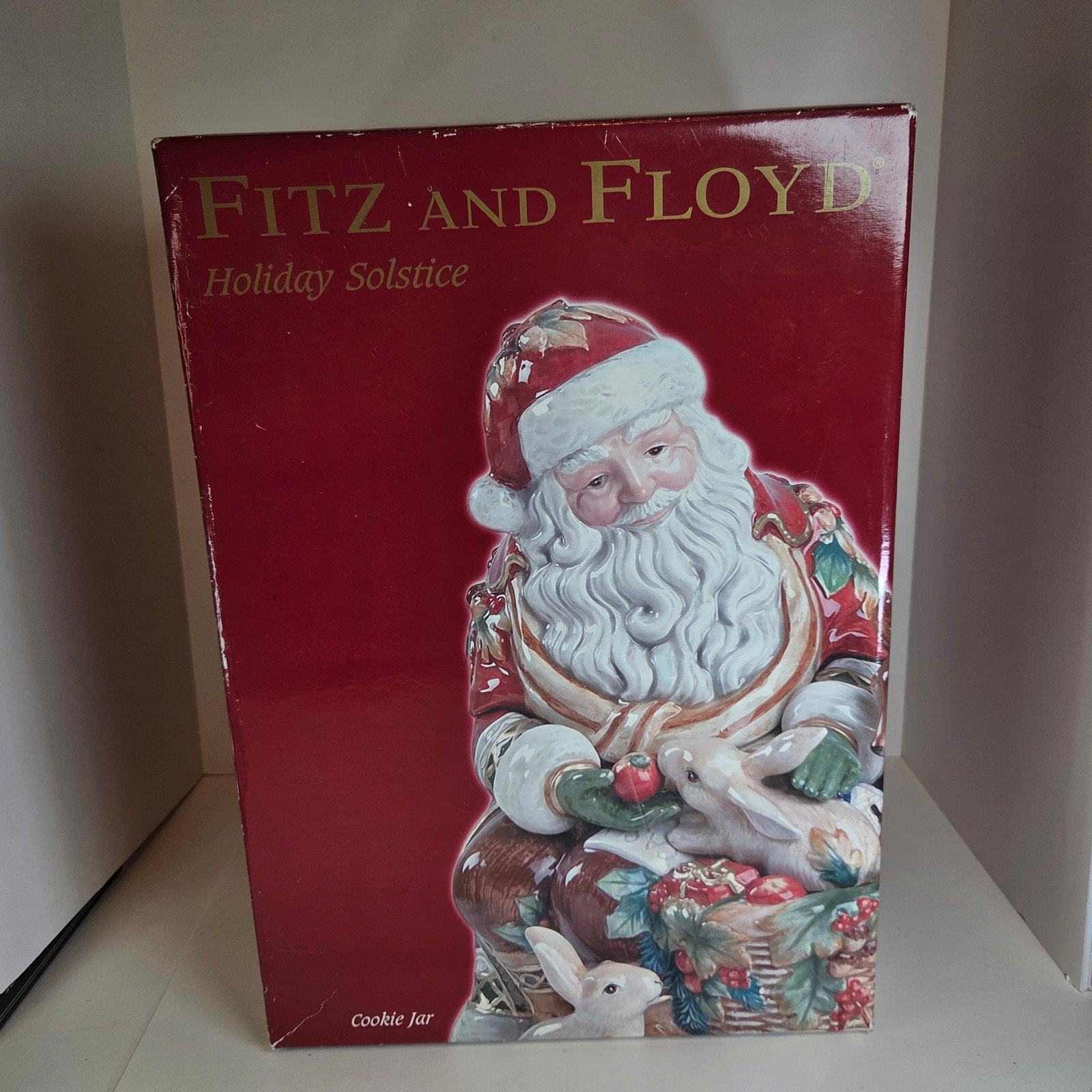 This Fitz Floyd Santa cookie jar brings festive cheer to any holiday kitchen! Hand-painted ceramic with classic Santa detailing, this jar includes its original box and lid. Please note: it has a visible base chip and hairline cracking (see photos). Still displays well and is perfect for collectors or seasonal decorators.
