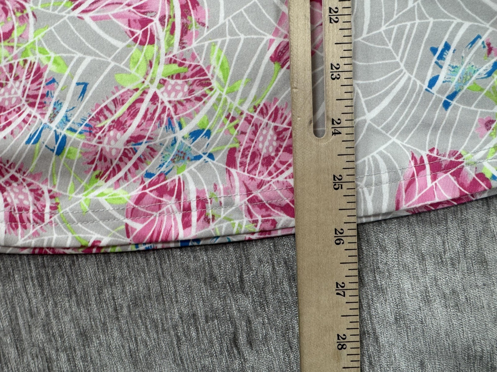 Color/Pattern: White/gray base with pink floral print and neon green/blue accents; magenta collar