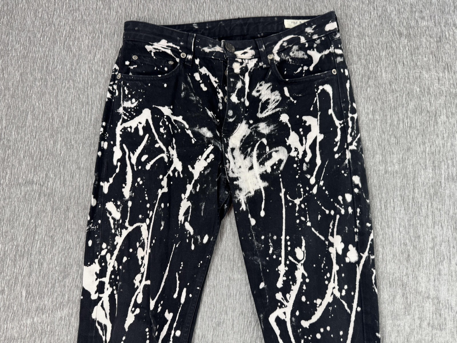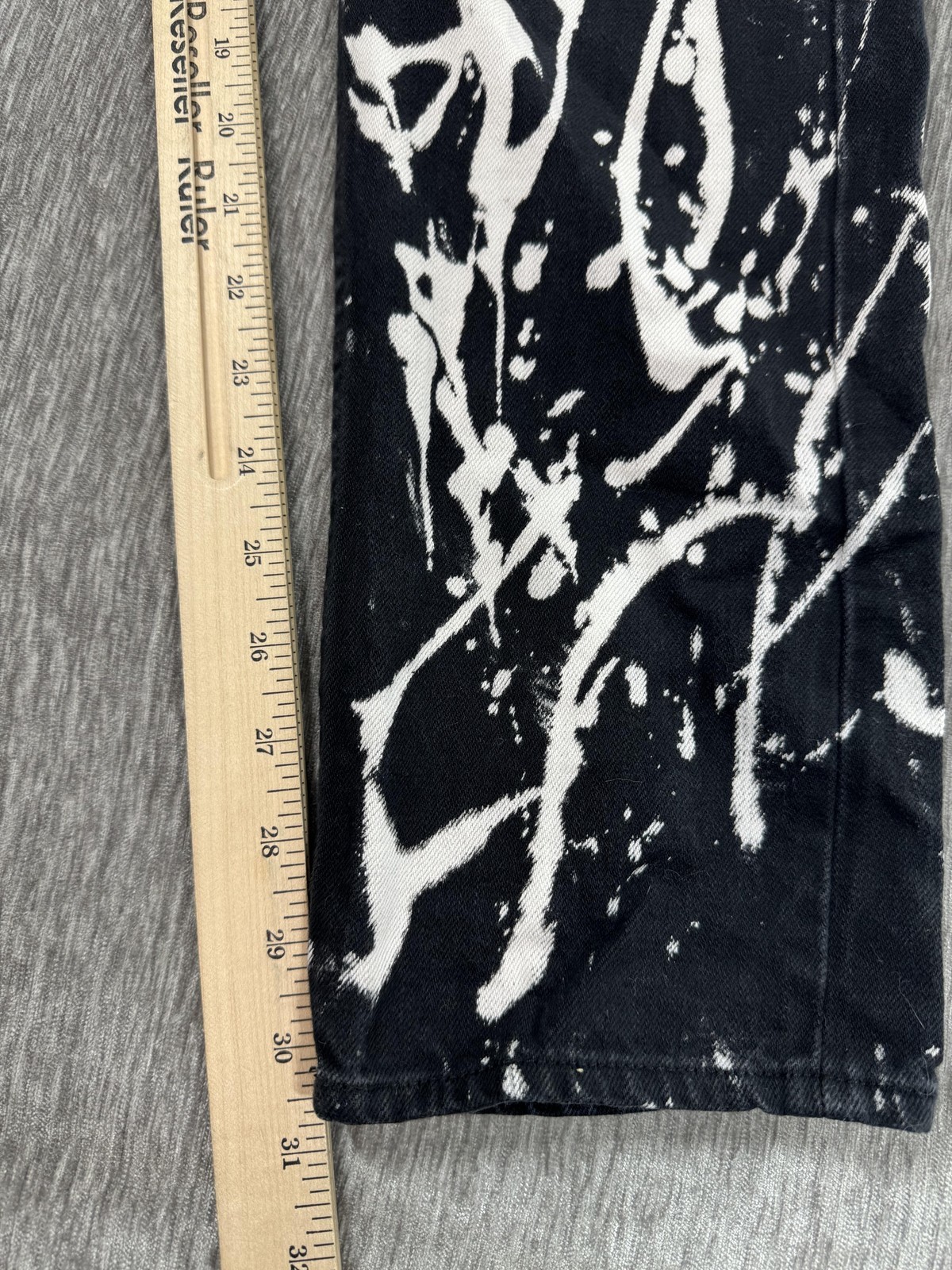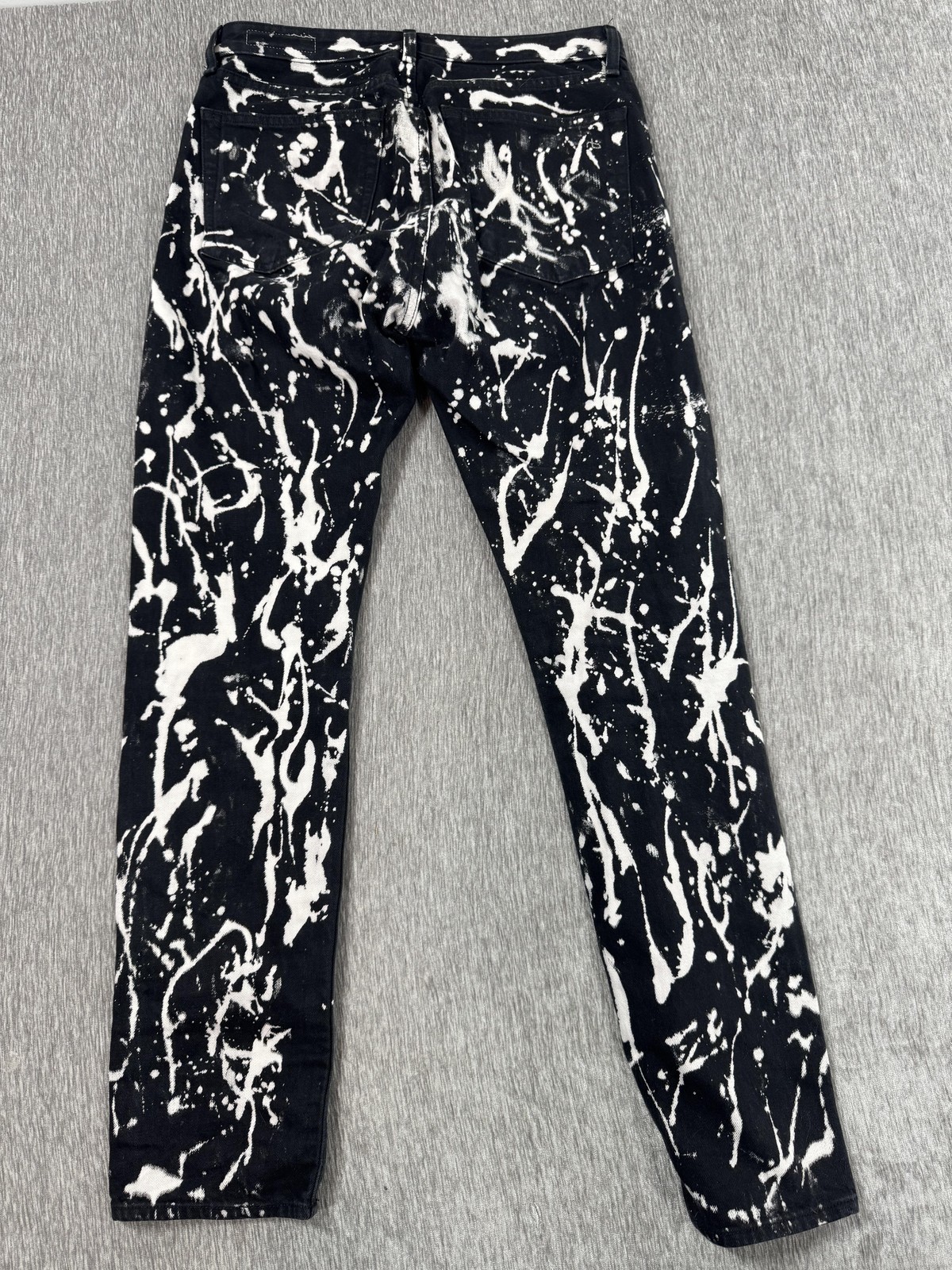 Color/Pattern: Black denim with white allover paint-splatter print (intentional design)