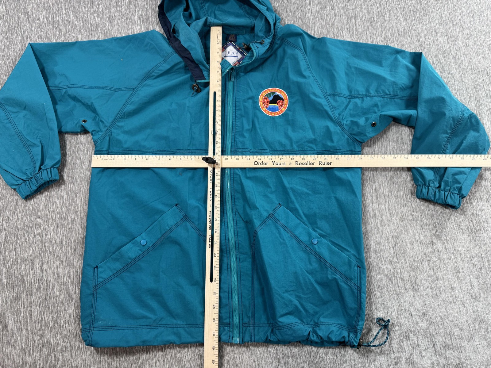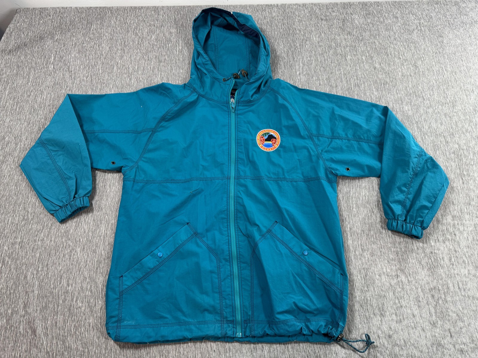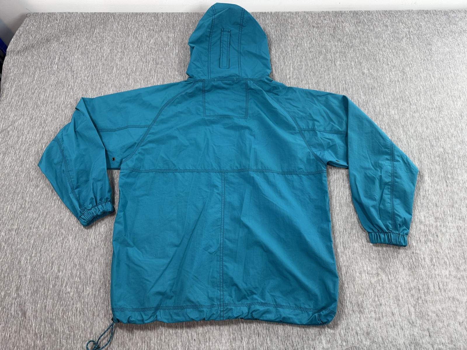 Features: Drawcord hood, full-length front zipper, elastic cuffs, drawcord hem, underarm ventilation grommets