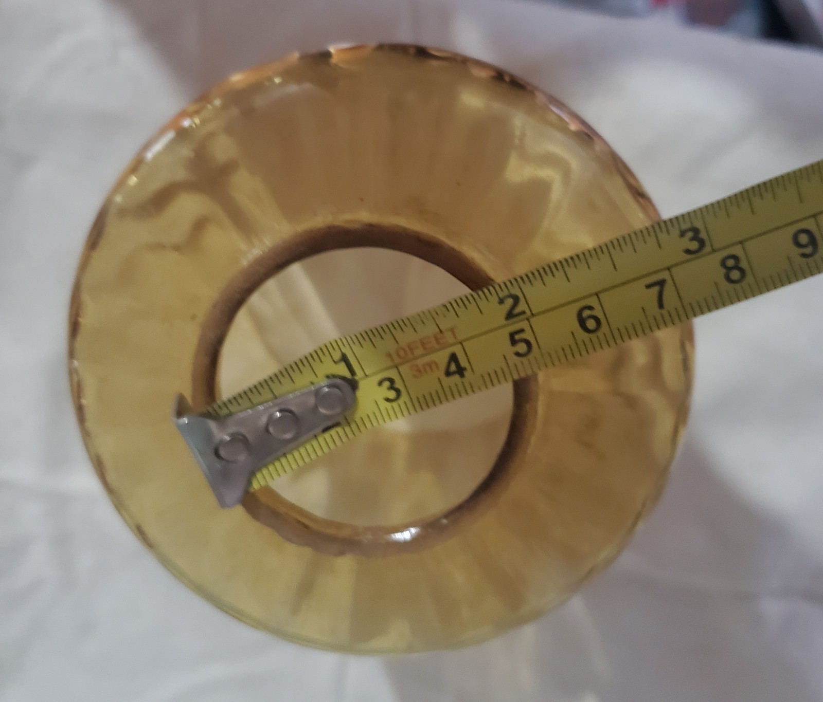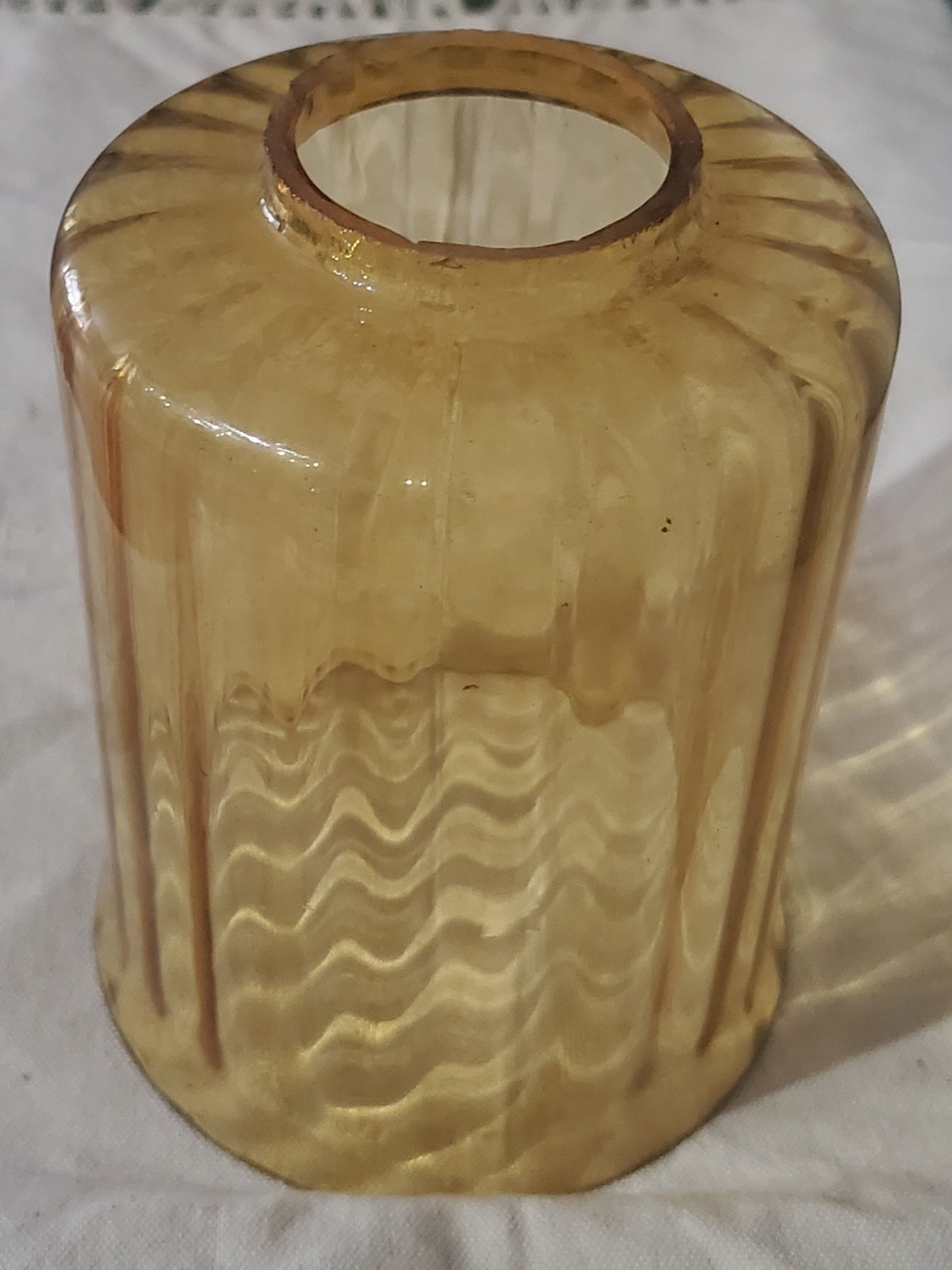 This vintage amber ribbed glass lamp shade features a 2" fitter and a height of approximately 5 1/2". The edge has a chip which is pretty hard to see, I tried to get it in the pictures. This was an estate find and has not been scrubbed clean.