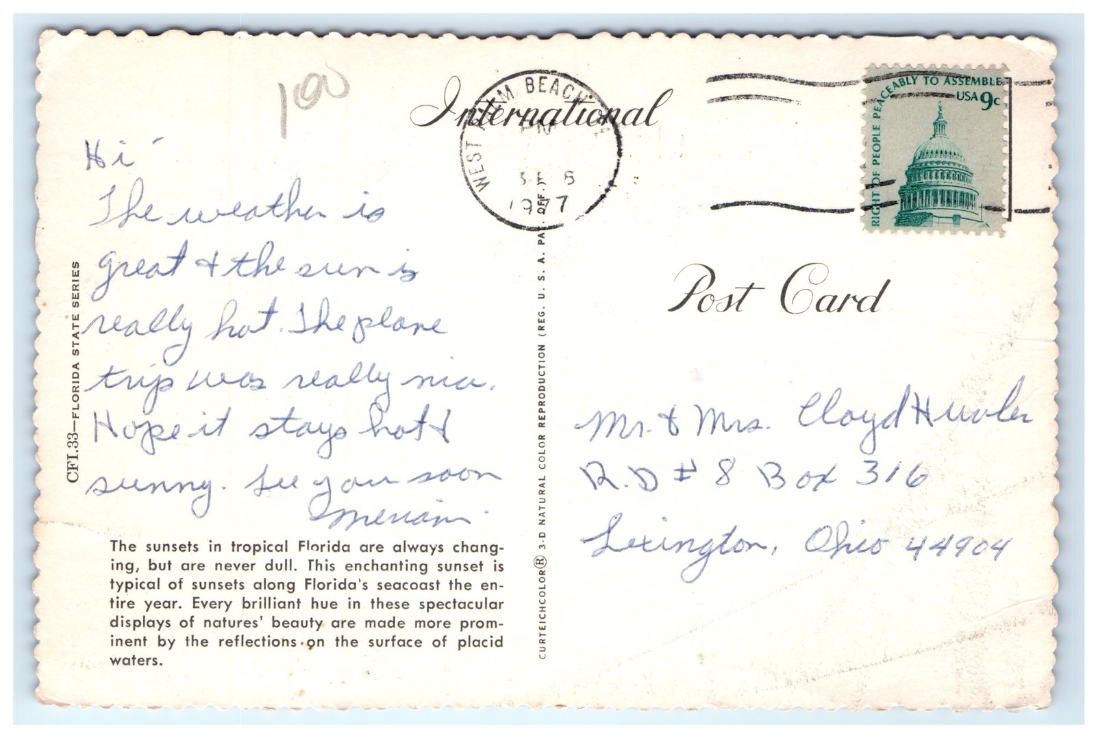 This vintage postcard features a vivid Florida sunset scene, showcasing the silhouette of palm trees against a brilliantly colored orange and red sky over calm coastal waters. The image captures a classic tropical sunset typical of Florida?s seacoast, emphasizing nature?s spectacular hues reflected on placid waters. The postcard is part of the Florida State Series (CFL 33) and was produced by Curt Teich, a renowned American publisher known for high-quality 3D natural color reproductions and lithographs.