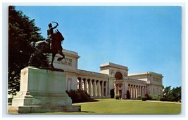 This vintage chrome postcard features a stunning lithographic image of the Palace of the Legion of Honor, San Francisco's largest art museum. Situated on a hill overlooking the iconic Golden Gate, the building is a memorial to California's fallen soldiers of World War I and showcases elegant 18th Century French architectural design. The image captures the museum's grand facade alongside a notable equestrian statue, framed by lush greenery and a clear blue sky.