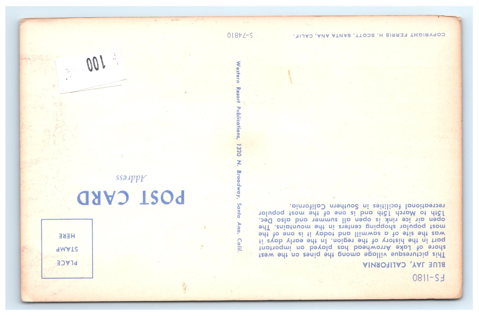 Printed by Western Resort Publications of Santa Ana, California, this postcard is an original chromolithograph, typical of mid-20th century resort postcards. The back includes detailed text describing Blue Jay's significance as a summer and winter destination with popular shopping centers and recreational facilities. The postcard also bears a copyright from H. Scott of Santa Ana, positioning it within a collectible niche of California mountain resort memorabilia.