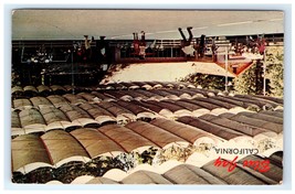 This vintage postcard features a scenic view of Blue Jay, California, showcasing rows of distinctive arched rooftops surrounded by lush greenery. Blue Jay is a charming village nestled on the west shore of Lake Arrowhead, a popular mountain resort area known for its pine trees and outdoor activities. The image captures the serene and inviting atmosphere of this mountain community, a favored getaway spot in Southern California.