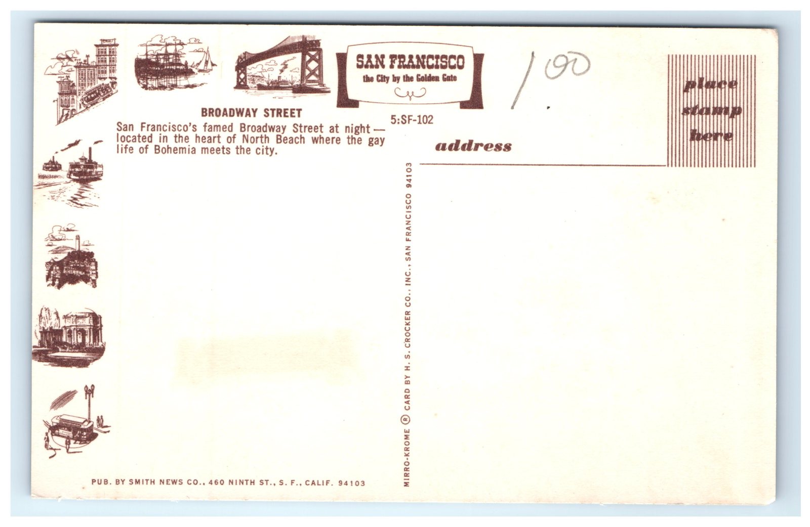 Published by Smith News Co. of San Francisco and printed by Mirro-Krome Card Co., this chrome postcard is a classic example of postcard lithography from the era. The back of the card includes a brief description highlighting Broadway Street's significance as a nightlife hub where 'the gay life of Bohemia meets the city.' The card?s publisher and printer details, along with the identifier 5:SF-102, add to its collectible appeal for enthusiasts of vintage San Francisco memorabilia and mid-century postcards.