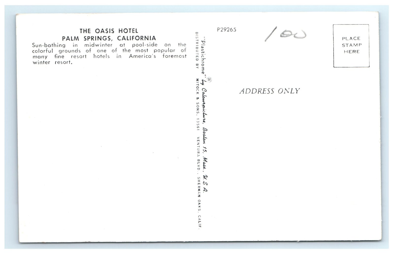 Published by Mitock Sons, Sherman Oaks, California, this collectible postcard is part of the "Plastichrome" series by Colorpicture. The back of the card provides a brief description highlighting the hotel's popularity as a winter resort. Measuring approximately 5.5 x 3.5 inches, this original printed lithograph postcard is a desirable piece for collectors of mid-century Americana, California travel memorabilia, and vintage hotel ephemera.