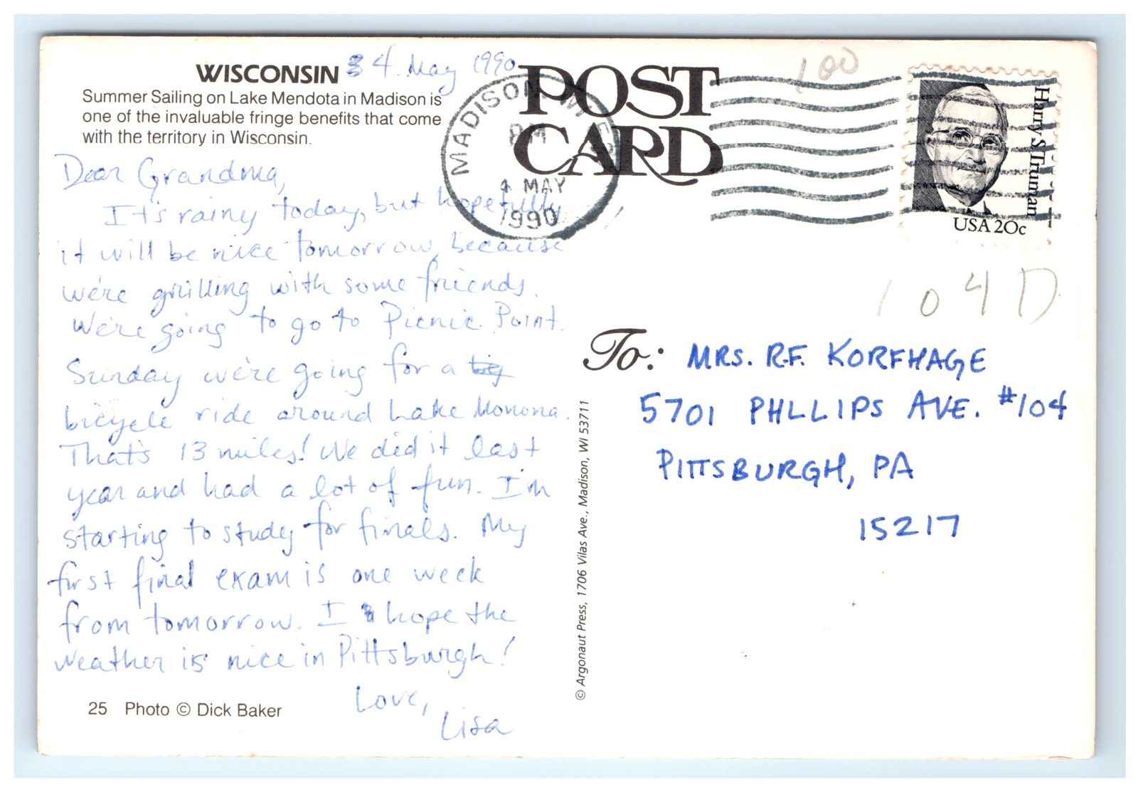 Published by Argonaut Press of Madison, WI, and photographed by Dick Baker, this postcard is a collectible example of mid-to-late 20th-century regional American imagery. It includes a chrome finish that enhances the vivid colors and adds a glossy appeal. The back of the card contains a brief description highlighting the local summer sailing culture on Lake Mendota, along with a handwritten message postmarked May 1990. This postcard offers historical and nostalgic value to collectors interested in Wisconsin, lake scenes, or vintage travel ephemera.