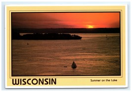 This original vintage postcard captures a breathtaking summer sunset over Lake Mendota in Madison, Wisconsin. The scenic lithograph features a tranquil lake scene with sailboats gently gliding across the water as the sun sets behind a distant tree-lined horizon. The warm orange and red hues create a serene and inviting atmosphere that perfectly embodies the peaceful charm of Wisconsin's renowned lakes.