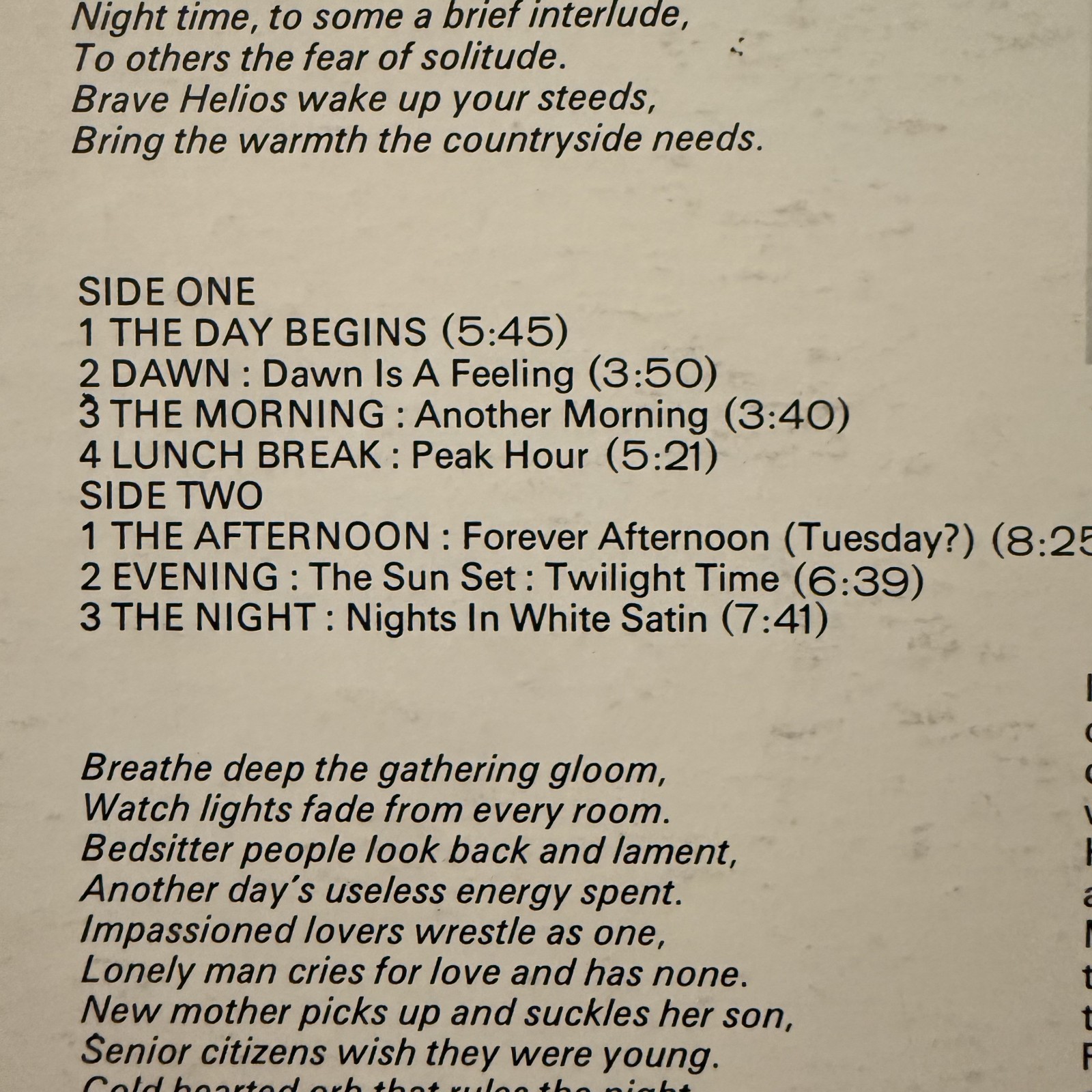 The album represents a significant creative turning point for the band. The album is their first with guitarist and singer Justin Hayward, who replaced Denny Laine, and bassist John Lodge, who replaced Clint Warwick. The album is also their first to feature longtime producer and collaborator Tony Clarke and the first to feature keyboardist Mike Pinder on Mellotron. These changes, combined with a shift away from R B covers toward original compositions and a thematic concept, helped define the band's sound for the next several albums and earned the group new critical and commercial success. The album was recorded to showcase the stereo recording techniques of Decca Records' new imprint, Deram. The label had requested the group record covers of pop and classical music along with an orchestra. Instead, the album features original compositions expressing the day in a life of an everyday person, interspersed with orchestral interludes arranged and conducted by Peter Knight and performed by the London Festival Orchestra.