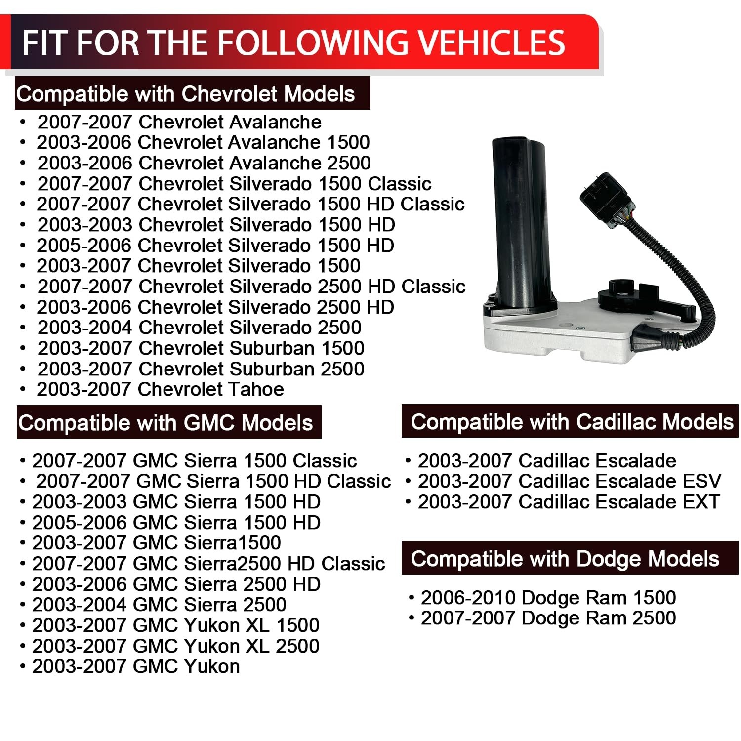 ?Vehicle Fitment 1?600-910 Transfer Case Motor Compatible with Chevy Silverado 1500 2003-2007, Silverado 1500 HD 2003 2005-2006, Silverado 2500 2003-2004, Silverado 1500 Classic / 1500 HD Classic / 2500 HD Classic 2007, Avalanche 1500/2500 2003-2006, Suburban1500/2500 2003-2007, Tahoe 2003-2007; Compatible with 2003-2007 Cadillac Escalade, Escalade ESV, Escalade EXT; Compatible with Dodge Ram 1500 2006-2010, Ram 2500 2007 ?Vehicle Fitment 2?Compatible with GMC Sierra 1500 2003-2007, Sierra 1500 Classic / 1500 HD Classic / 2500 HD Classic 2007, Sierra 1500HD 2003 2005-2006, Sierra 2500 2003-2004, Yukon / Yukon XL 1500/ Yukon XL 2500 2003-2007.For more vehicle fitment information, please check the fitment table ?OEM Part Number?Replace 600-910, 19125571,12384980,12584314, 88962314,19125640, 5170543AA, 48-113, 600-2292, 142145, 20-00138, 42000138, 600910. The connector pins need to be checked. If the connectors do not match, the part will not fit. Do not energize and change the position of the splitter box motor before installing, only change the position of the gears to align with the shift motor! [Excellent Performance] NITOYO Transfer Case Shift Encoder Motor is made of high quality metal with corrosion resistant housing. The motor meets the original specifications, with upgraded gears for smooth switching between 2WD and 4x4 (4WD) four wheel drive, good quality and long service life [Choosing the Right Part] Before buying, research to make sure the part fits your vehicle; enter all vehicle information (year, make, model, engine, and interior) to ensure compatibility, and check the qualifying instructions and that a professional installation is recommended
