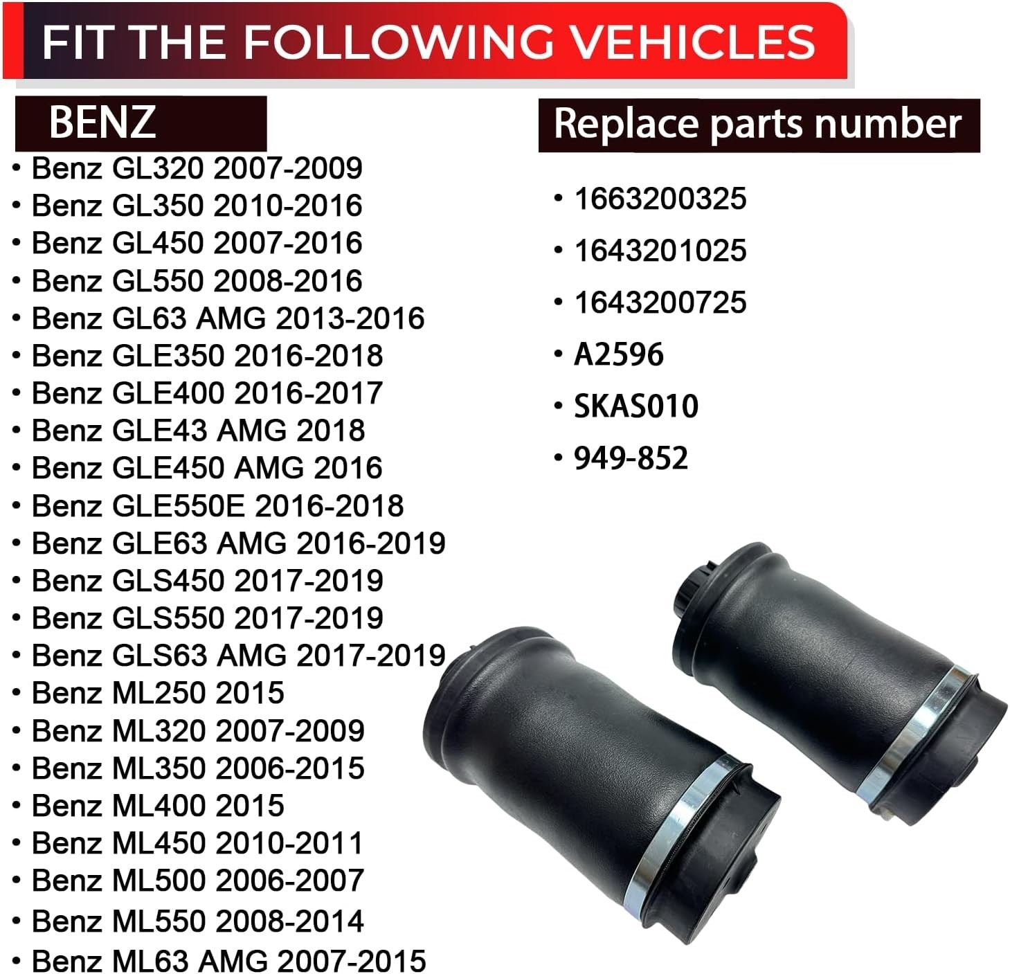 Compatible with 2007-2017 Mercedes-Benz GL320, GL350, GL450, GL550, GL63 AMG, GLS450, GLS550, GLS63 AMG (X164/X166 W/ Airmatic); Compatible with Mercedes-Benz 2006-2019 GLE350, GLE400, GLE550E, GLE63 AMG, ML250, ML320, ML350, ML400, ML450, ML500, ML550, ML63 AMG (W164/W166 W/ Airmatic). For more information, please see the fitment table
