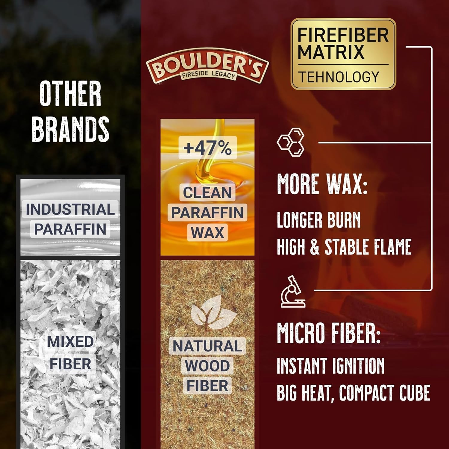 100% NATURAL FIRE STARTERS - Made from natural wood fibers and wax. Clean, safe, natural firestarter cubes. Great alternative to fire starter bricks, logs, gel, sticks, and toxic lighter fluid. WATERPROOF, WINDPROOF INSTANT IGNITION - Ignites in seconds, even in wet or windy conditions. Perfect for fire pits, fireplaces, BBQ grills, charcoal, wood stoves. Camping essentials for hiking outdoors. LONG-LASTING BURN TIME - Burns for 8-10 minutes with steady high flame. Works great for campfires, firewood, starter logs, charcoal chimney, compressed wood bricks, and indoor wood stove fires. CHARCOAL BBQ FIRE STARTER - Safe and odorless choice for grilling and cook-fires. Lights charcoal fast without lighter fluid, gel, or fire sticks. Use for BBQ, camping, outdoor cooking, and smoker boxes. ADVANCED FIREFIBER MATRIX TECHNOLOGY - Proprietary blend of wax and microfiber delivers instant ignition and high flame. Reliable for fireplaces, fire pits, grilling, cooking, camping, and survival fire starter kits.