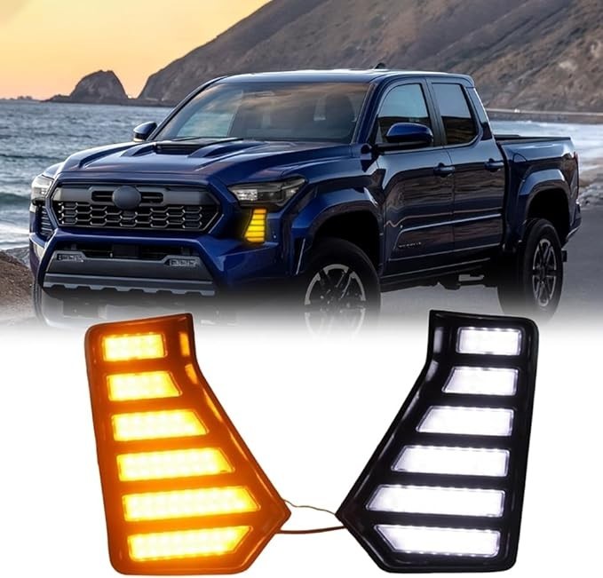 [Vehicle Fitment] Compatible with Toyota Tacoma 2024 2025 LED front bumper fog lights. (Please check your vehicle model before your purchase this driving light) [Dual-colour light design] The 2024 tacoma fog lamp Kit integrates dynamic daytime running lights and sequential turn signals with a unique flow mode, greatly enhancing a sleek look. Geometric lines design light module. Pure colour temperature, flicker-free. White light: Daytime Running Lights with start-up animation. Amber light: Sequential Turn Signal [Excellent Material] The 2024 tacoma DRL lights are made of sturdy ABS housing and reinforced shatterproof tough PC lens, with good waterproof, shockproof, dustproof and corrosion-resistant performance, durable and longer service life [Energy-Saving and Environmentally Friendly] High quality replacement Front Fog Lights for 2024 2025 Tacoma. With plugs, easy to install and use, brighter LED light source, less power consumption, stable light output [Package Information] 1 Pair LED Daytime Running Lights + 1 Set Wiring Harness + 5pcs Wire Clips