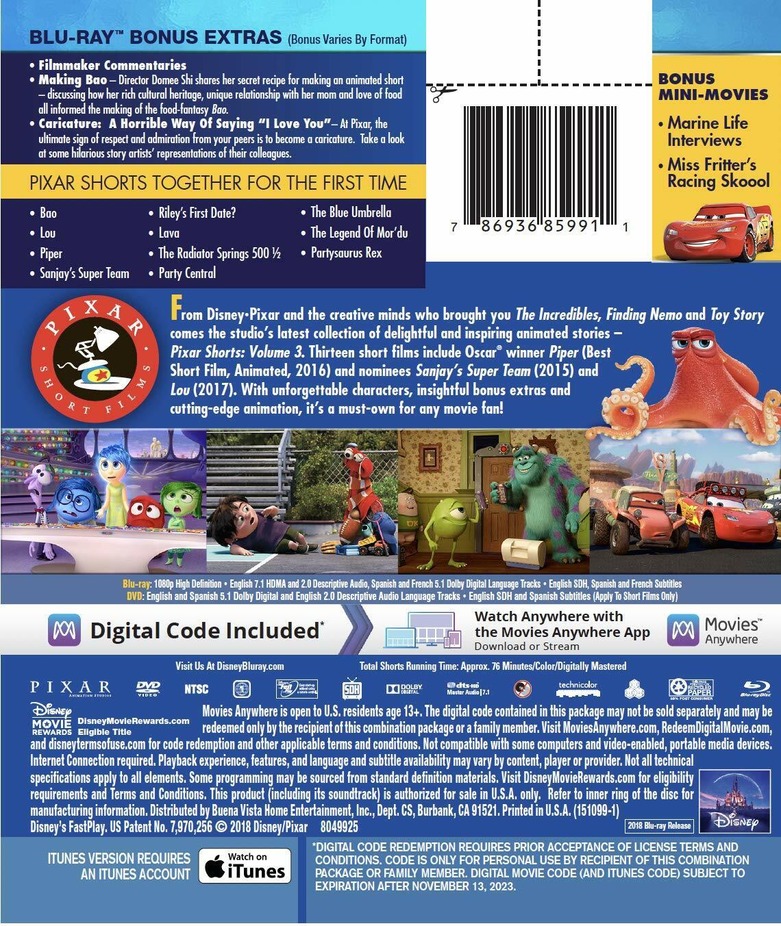 PIXAR SHORT FILMS COLLECTION Vol. 3 Blu Ray DVD and Digital with Slip Cover New