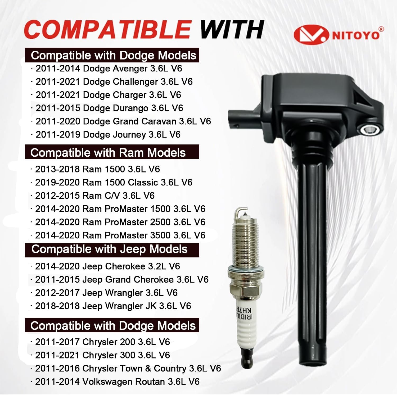 [Reference Number] Replaces C1791, 5C1848, E1148, 05149168AI, 5149168AH, 5149168AI, 5149168AJ ,GN10616, 36-8196, 0221504032, 97390. Ignition Coil Compatible with Chrysler 200 2011-2017 3.6L, 300 2011-2021 3.6L, Town Country 2011-2016 3.6L; Compatible with Ram 1500 2013-2018 3.6L, 1500 Classic 2019-2020 3.6L, C/V 2012-2015 3.6L, ProMaster 1500 2500 3500 2014-2020 3.6L; [Vehicle Fitment] Spark Plugs and Coil Packs kit Compatible with Dodge Avenger 2011-2014 3.6L, Challenger Charger 2011-2021 3.6L, Journey 2011-2019 3.6L, Durango 2011-2015 3.6L, Grand Caravan 2011-2020 3.6L; Compatible with Jeep Cherokee 2014-2020 3.2L, Grand Cherokee 2011-2015 3.6L, Wrangler 2012-2017 3.6L, Wrangler JK 2018 3.6L; Compatible with Volkswagen Routan 2011-2014 3.6L [Superior quality] Ignition Coil Pack is made of high quality material, with good heat dissipation performance, and can resist the heat and thermal cycle caused by the fracture, so as to better transfer the high voltage generated by the spark plug, to ensure the accuracy of the ignition time, improve the combustion efficiency, reduce exhaust gas emissions [Enhanced Coil and Spark Plug] Set of 6 Ignition Coil Packs and Spark Plugs. Match with original parts, easy and quick installation, while the new ignition coil, effectively provide the proper voltage to the spark plug electrode, to provide excellent cold start performance and smoother engine running, long service life [Choosing the Right Part] Before buying, research to make sure the part fits your vehicle; enter all vehicle information (year, make, model, engine, and interior) to ensure compatibility, and check the qualifying instructions and that a professional installation is recommended