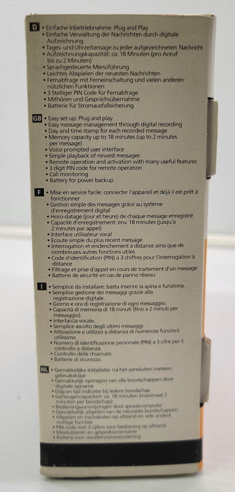 Answering machine is un-used vintage retro item in open box that has been in storage for some time.