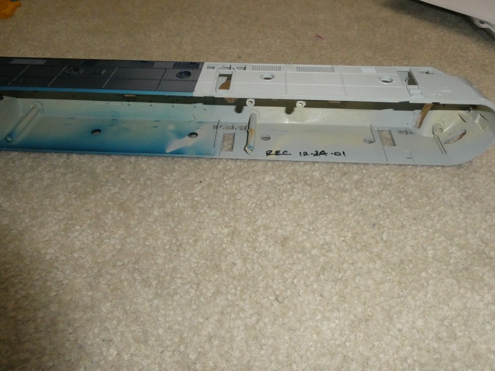You are bidding on a nice looking, MTH O Gauge, unused sample locomotive body or shell, undecorated blue and gray, in the pictures. 17 inches long. Unused factory sample with some writing on the inside and on top as shown, cleaning needed, some light scratches, no trim and comes as shown. Zoom in for details.