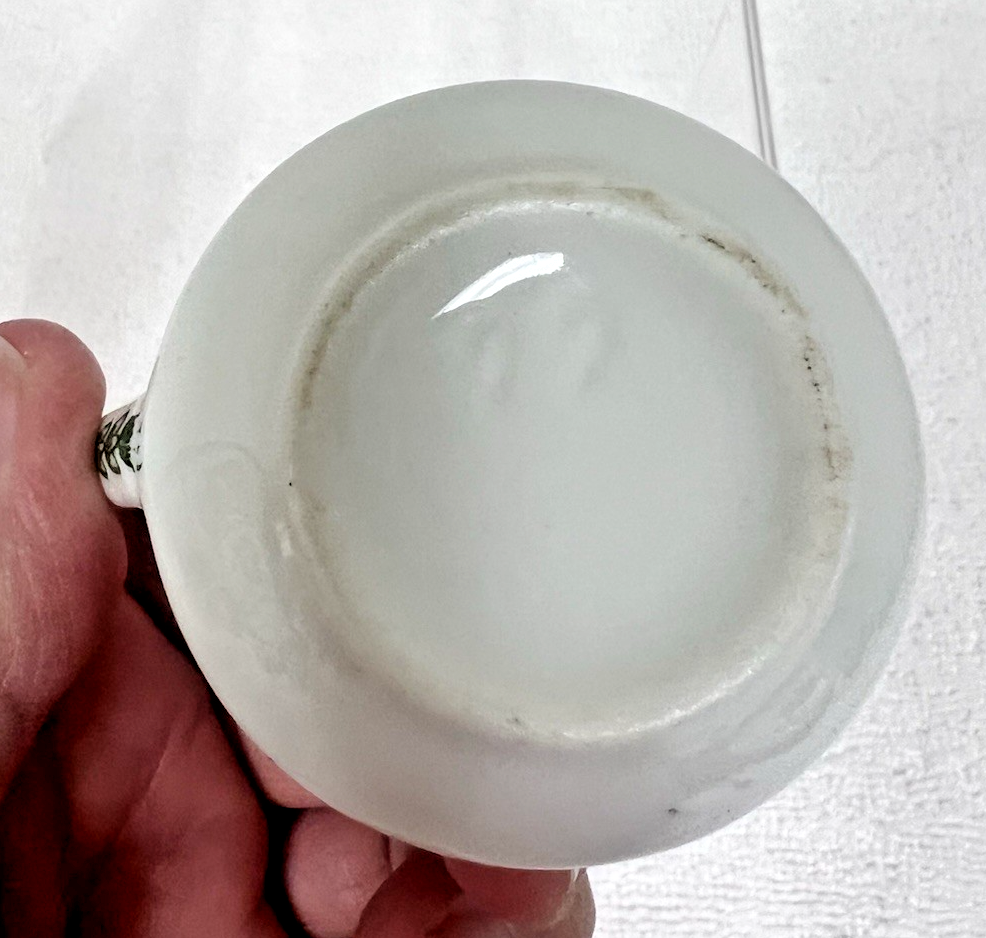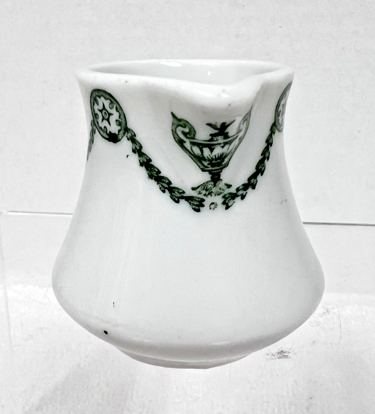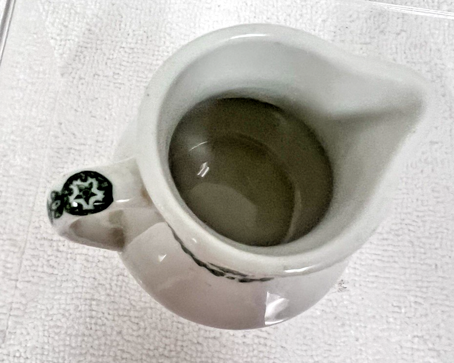 Vintage Restuarant Ware Tiny Creamer w Green Garland 2" tall in great shape the bottom has I think 66 on the bottom indented? it only 2 inches tall the widest part is also about 2 inches no chips or crack also the inside is white we are not sure why it went dark in the photo