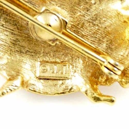 Vintage brooch by J.J. measures 1 1/4? x 1 3/8? ; a unique goldtone beetle with red and white enameled stripes and painted black eyes. The black paint is worn off of one eye, but it is otherwise in excellent condition.