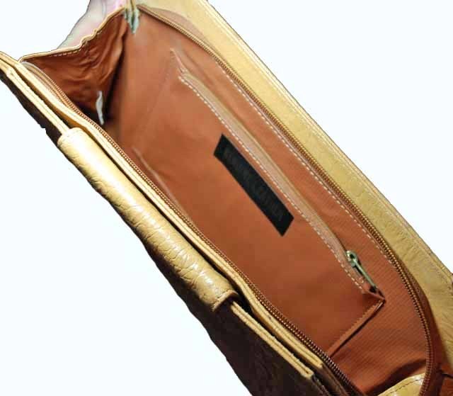 Genuine leather clutch is finished in an alligator texture and has two pockets- one with a snap closure and the other has a zipper close. It has a bold triangular flap closure as well as a zipper closure across the top. Lined in dark caramel vinyl. Made in Korea. Has a 1940's look in case you need it for a show.