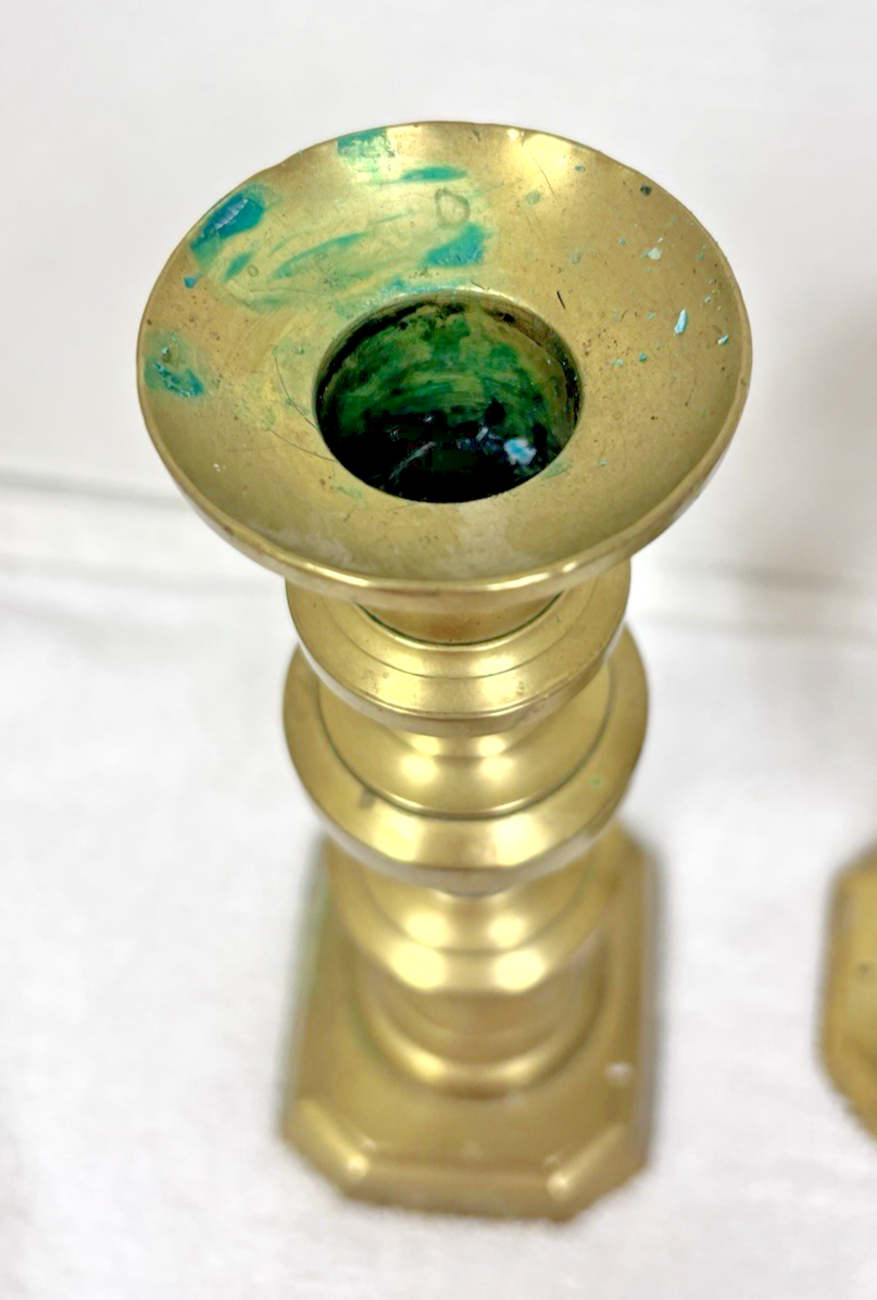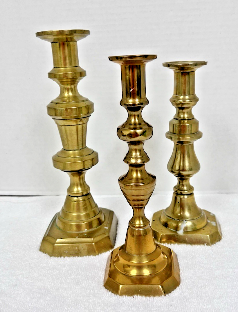 3 Older Brass Candlestick Candle Holders Mixed Designs largest 10" medium with the diamond and beehive center 8 7/8" smallest 8.5" they are all in good shape and have not been polished (I prefer un-polished) and yes they have some wax on them and the green on the largest is wax...sold as a lot only