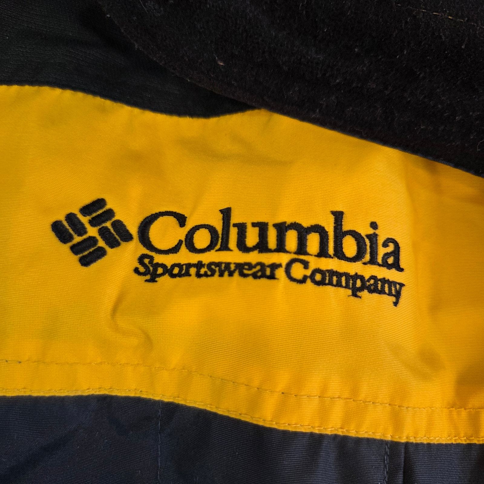 This is a vintage Columbia Sportswear men?s parka from the 1990s, size Large. It features a navy shell with yellow and black colorblock accents, fleece-lined collar, and insulated lining for warmth.