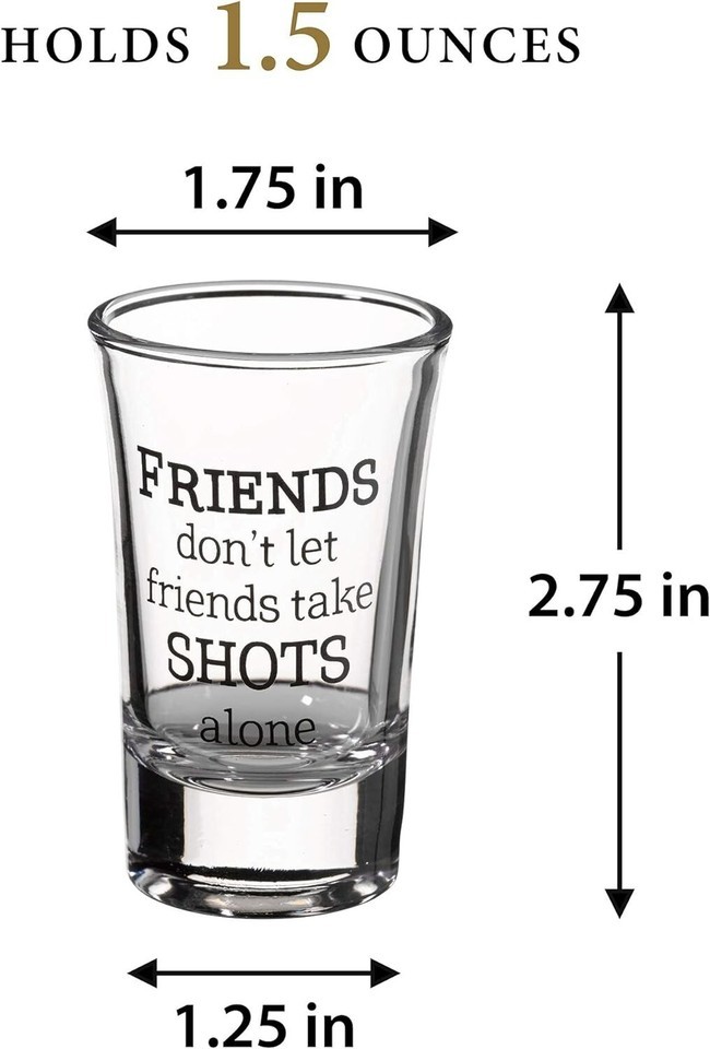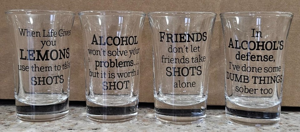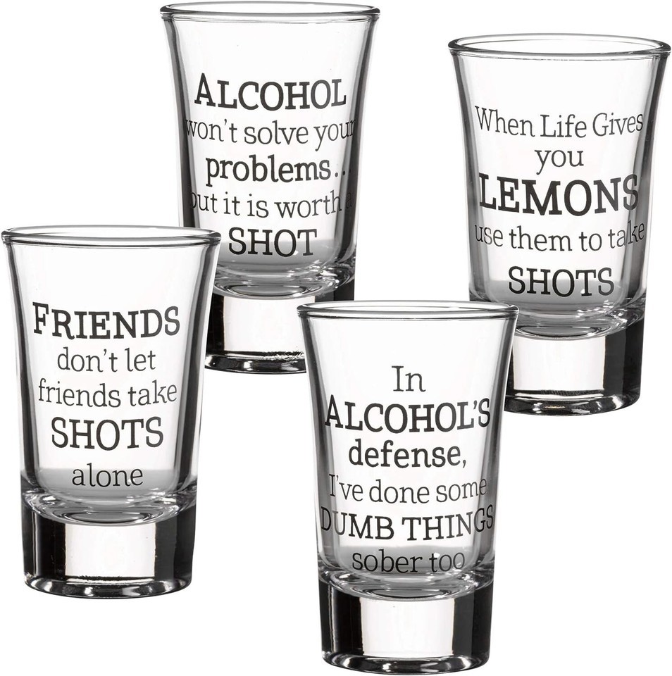 "each glass has a funny and unique quote: ""alcohol won?t solve your problems. but it is worth a shot"", ""in alcohol's defense, i?ve done some dumb things sober too"", ""friends don?t let friends take shots alone"", and ""when life gives you lemons use them to take shots""."