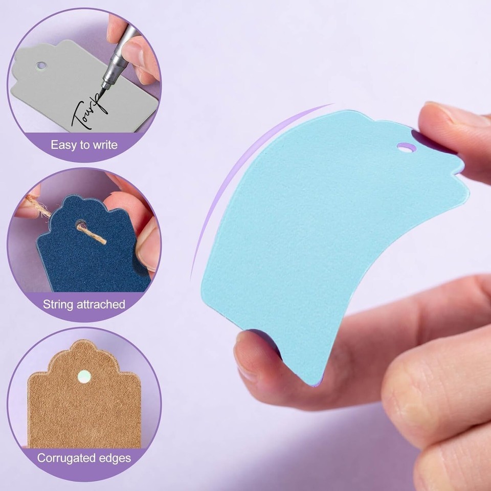 ?HIGH QUALITY GIFT TAGS?: The price tags are made from high quality kraft paper card, no bleed through with pens, pencils, and markers. The jute twine made from natural materials has no chemicals smell that is friendly to environment. It is naturally sturdy and durable that has a long lifetime. The gift tag perfectly match the jute twine, so you don't need to pay extra efforts to search for the best style-matching twine.
