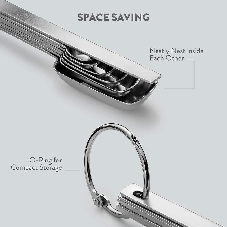 SPACE SAVING - The measuring spoons neatly nest inside each other and come with an ergonomic O-ring for compact, organized storage. The tilted handles enable them to be independently set down.