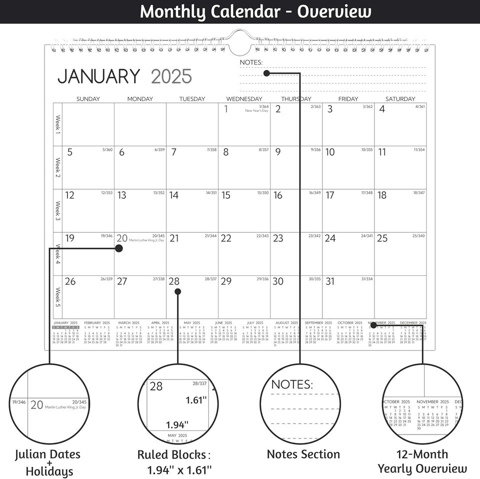 ?? PLENTY OF WRITING SPACE ? This 2024-2025 calendar has large daily blocks for busy daily scheduling, Notes section to write down your important items and memos. Plus, yearly overview at the bottom lets you quickly find the dates you want without having to turn the pages, making your schedule easier and more organized?