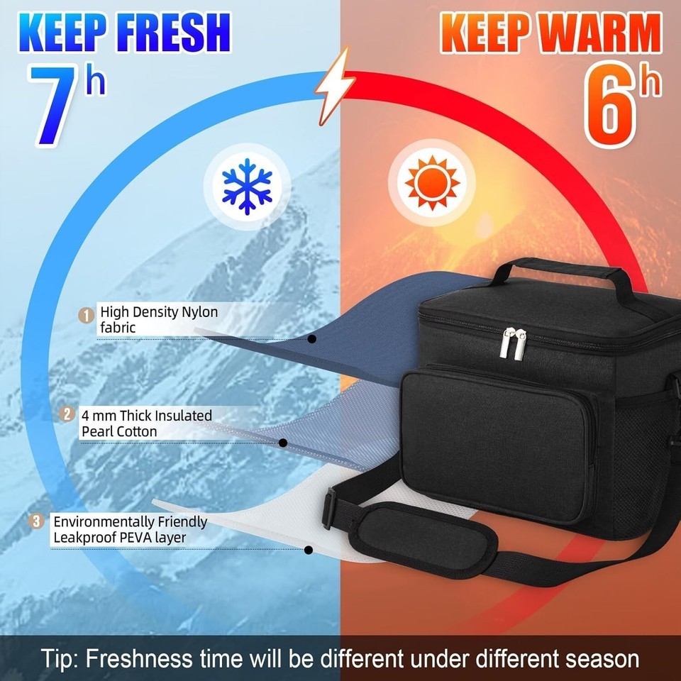 Multi Compartments: The lunch bag measures 10" x 6.7" x 8.1". It's designed with reasonable organizational compartments. It provides you with plenty of space to pack all of your food and snacks, or other small stuffs.