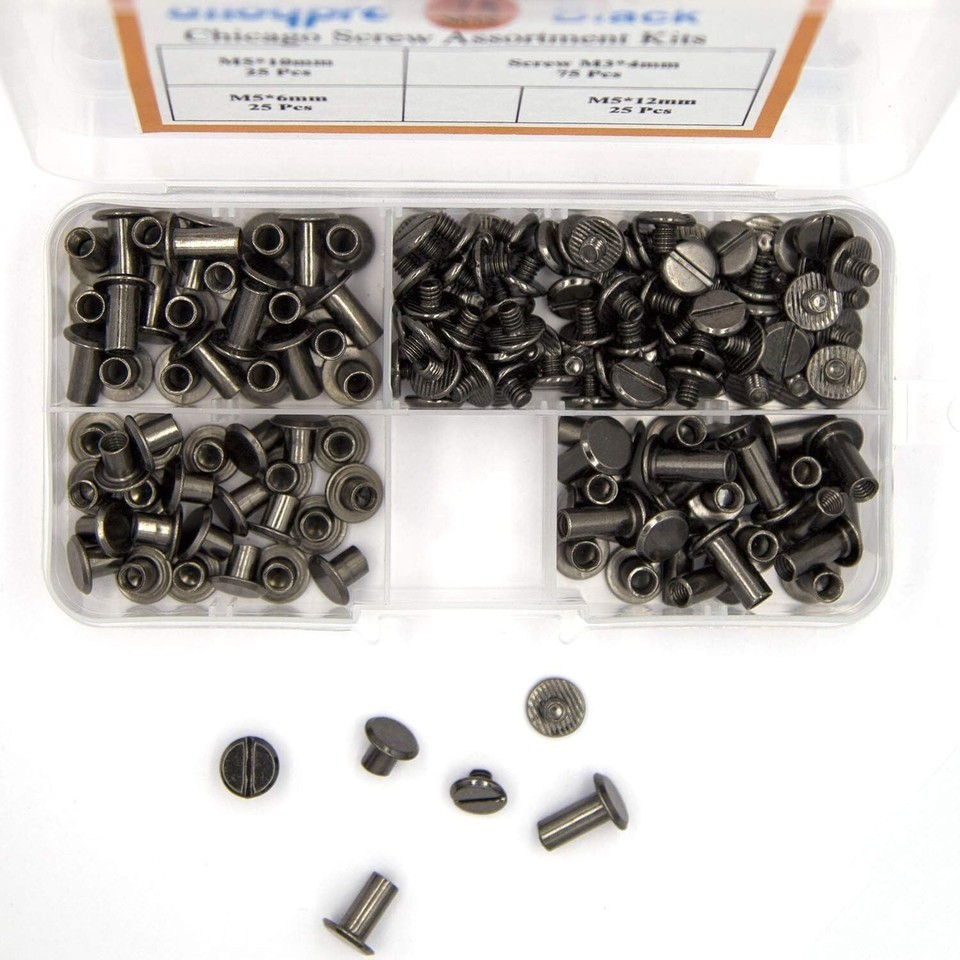 75 sets of 3 sizes:The chicago rivets set kit include 3 sizes, 25 sets for each size, the diameter of these screw rivtes are all 5mm(3/16 inch). 3 kind of post length are 6mm(1/4 inch), 10mm(3/8 inch),12mm(1/2 inch).Various lengths are available to meet your different needs.