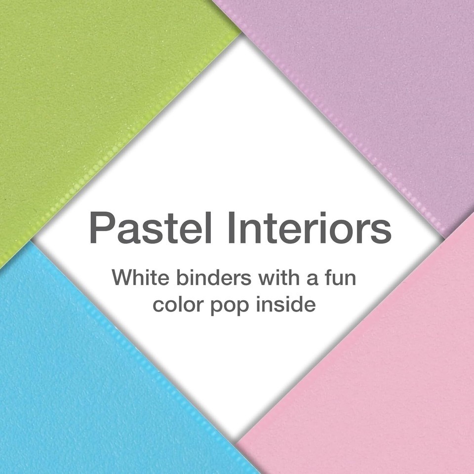 Cardinal Economy 3 Ring Binders are white with pastel interiors; two-tone binders are ideal for color-coded organization at home, school or office; assorted pastel colors: pink, purple, green and blue