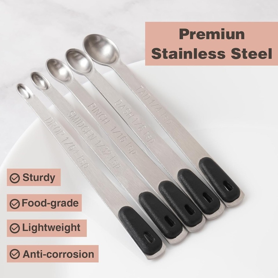 Measuring Spoons Set of 5, Tiny Stainless Steel Measuring Spoons with Black Sili