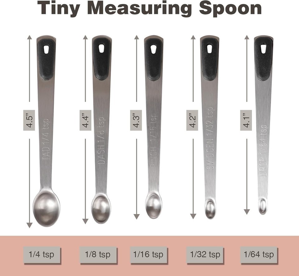 ?Mini Size? The set contains 5 mini measuring spoons with capacities of 1/64tsp, 1/32tsp, 1/16tsp, 1/8tsp, 1/4tsp, they will make your job easier when you need to measure small amounts of spices